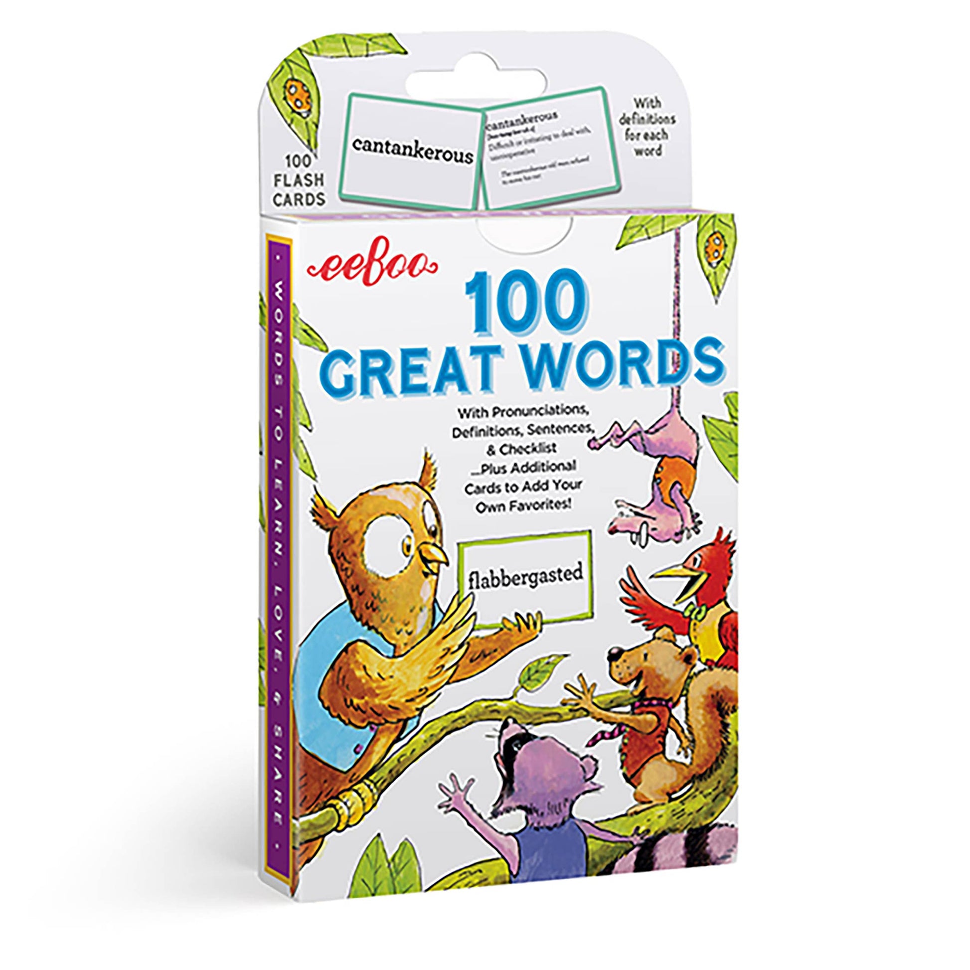 Featuring 100 unique and playful words, eeBoo's Great Words flash cards are the perfect way to add some quirkiness to your daily vocabulary. Each card includes the word, pronunciation, and a fun example sentence. Get ready to upgrade your language skills and become a master wordsmith, from introverted to talkative, with eeBoo's 100 Great Words!