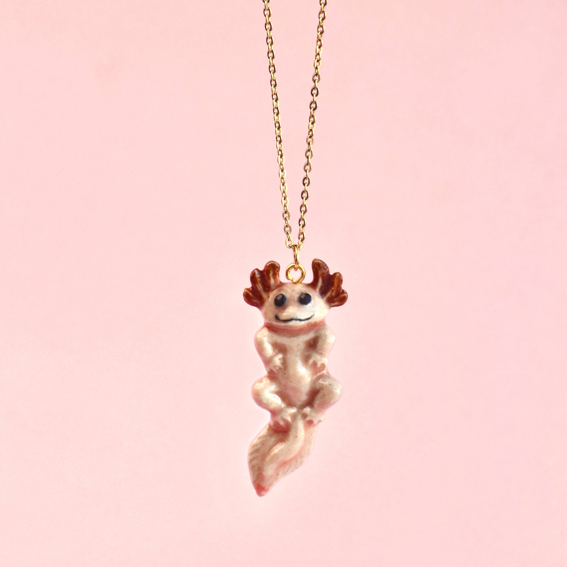 Explore the charm of ancient times with this exclusive Axolotl Necklace by Camp Hollow! This handcrafted ceramic pendant showcases a peach-colored axolotl, a rare salamander native to the historic lakes of Xochimilco, Mexico. Dangling from a gleaming golden cord, this necklace is an adaptable and captivating addition to any outfit. Due to the handmade nature of this item, slight variations in color and design may occur, adding to its unique character. Ideal for nature enthusiasts, admirers of the extraordinary, and those who appreciate the fusion of fashion, craftsmanship, and a hint of underwater enchantment.