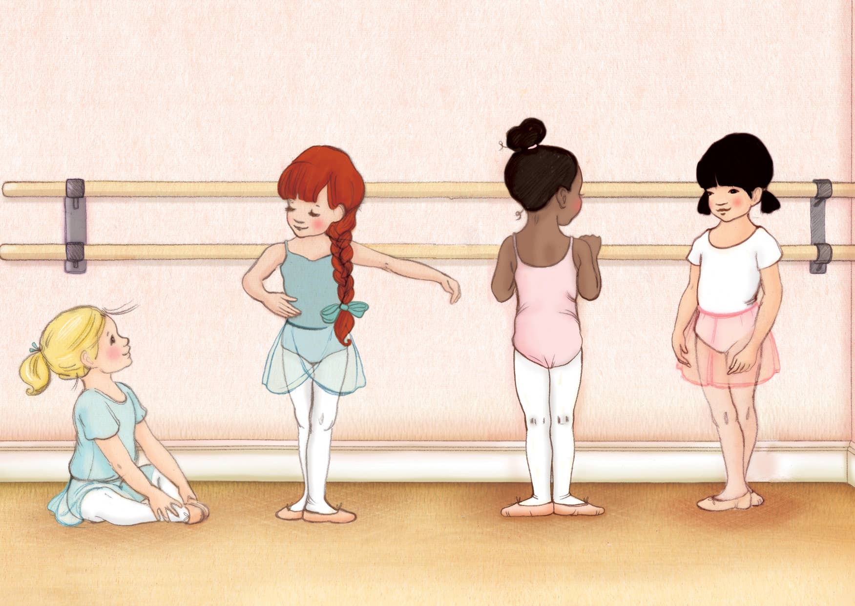 This postcard showcases four young ballerinas. Eager to learn, they line up on the barre for their ballet class.