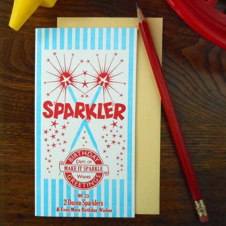 Summer brings sunshine, swimming, ice cream, and fireworks! Sparklers were a beloved tradition in our family, and we always had plenty of boxes to light up our summer nights. They were the only firework we could safely play with, without mom's watchful eye. This card is a nod to vintage sparkler packaging, printed with 2 bright colors on sturdy white cardstock and comes with a blank manila envelope.