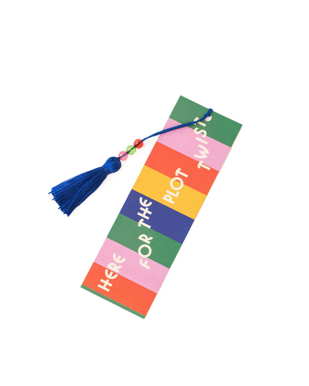 This bookmark is an especially cheery way to keep your spot in that book, planner, or magazine. It features a bold colorblock design, coordinating tassel, and HERE FOR THE PLOT TWIST in a fun font.
