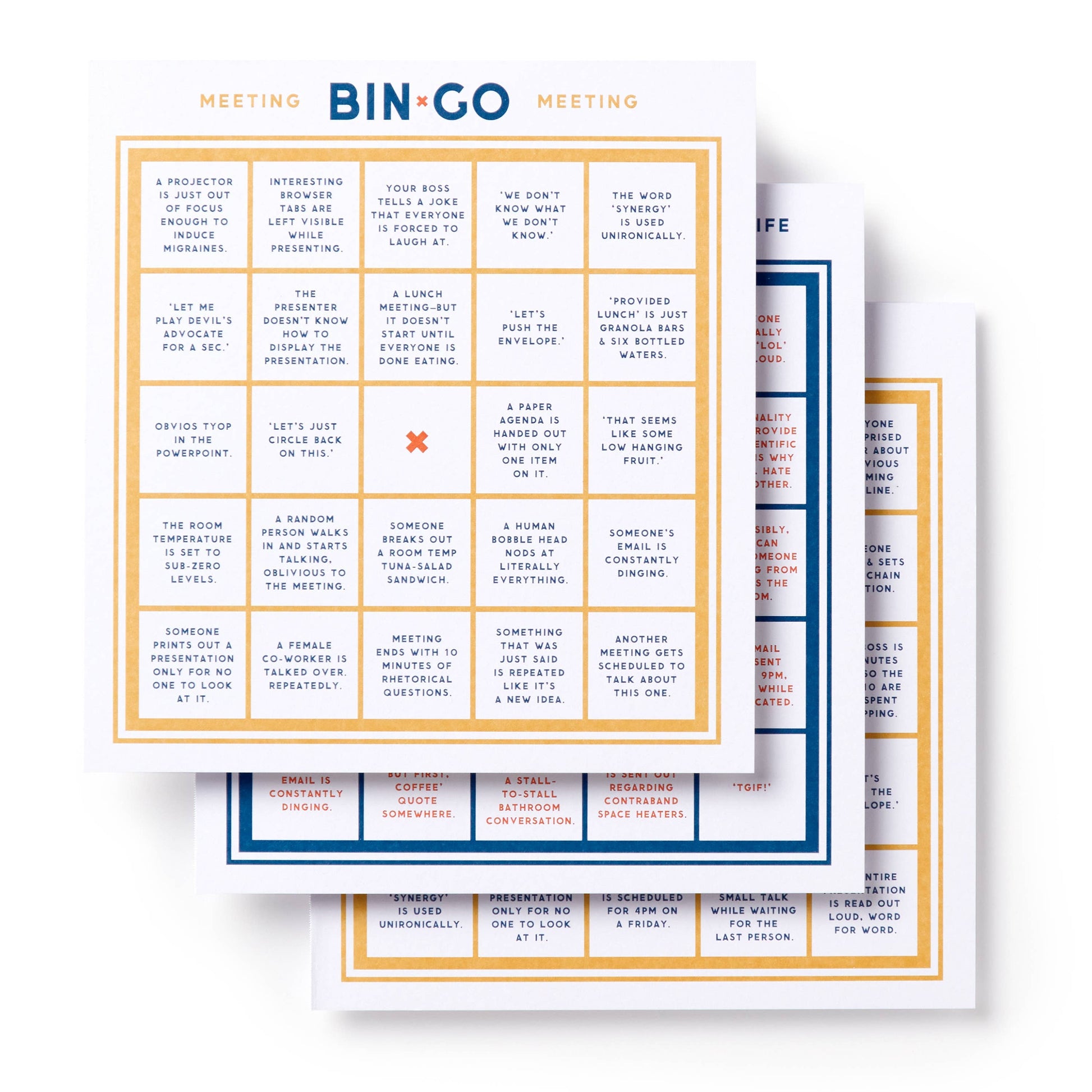 - Features two distinct people-watching bingo games–one for meetings and one for general office life.