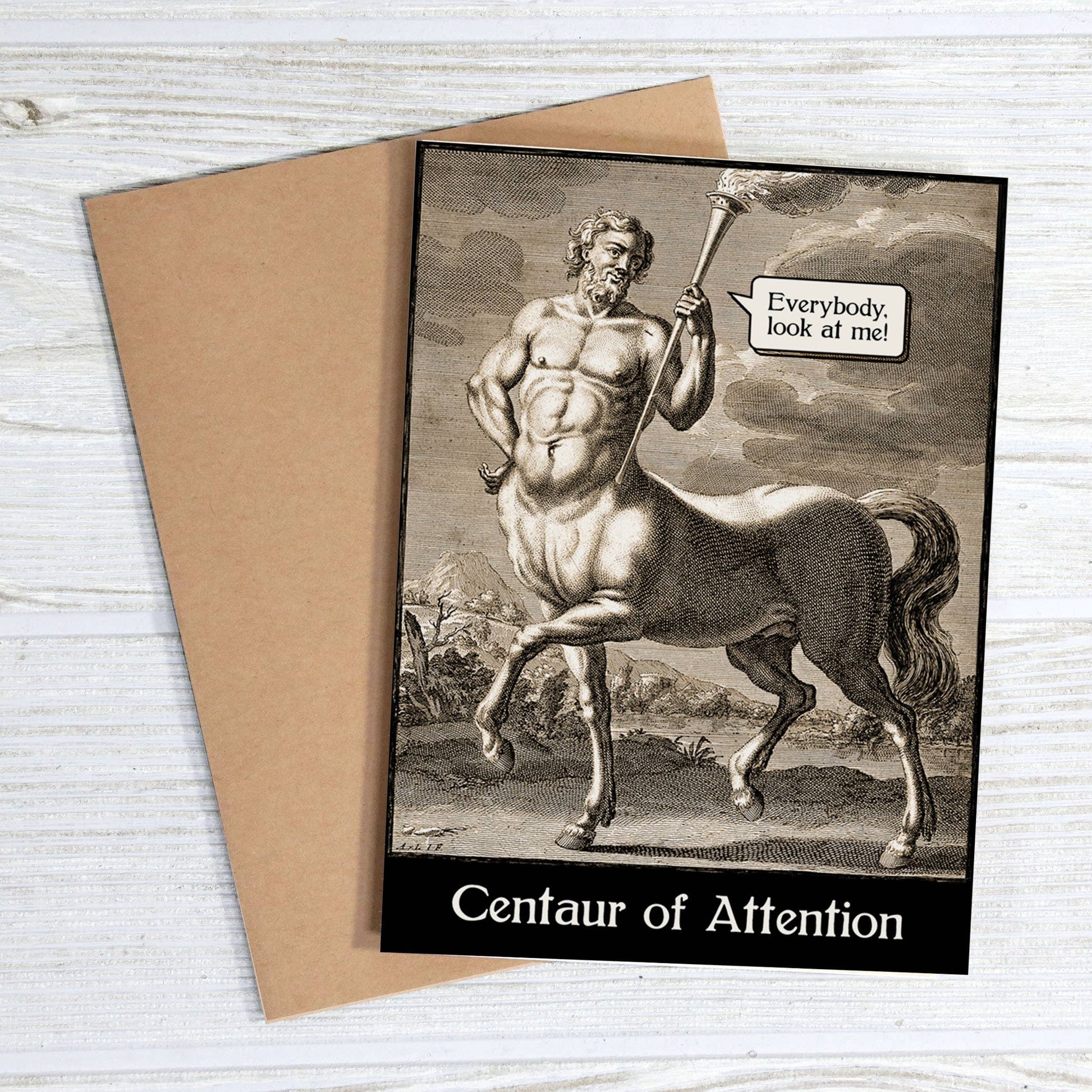 Centaur of Attention: Everybody, Look At Me! - Funny Vintage Illustration Card. We all know that one person who loves being the center of attention, and our hilarious pun greeting card, "Centaur of Attention," is the perfect way to playfully tease them. With a vintage illustration of a confident centaur exclaiming, "Everybody, look at me!", this card captures their larger-than-life personality.