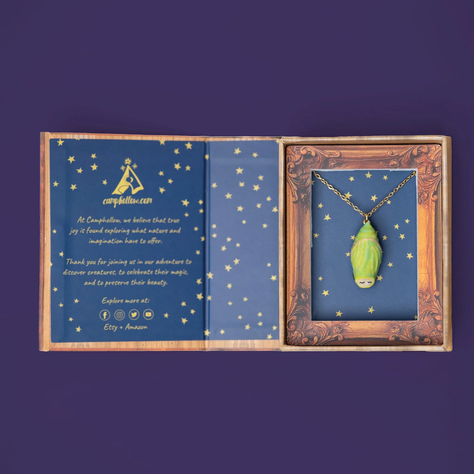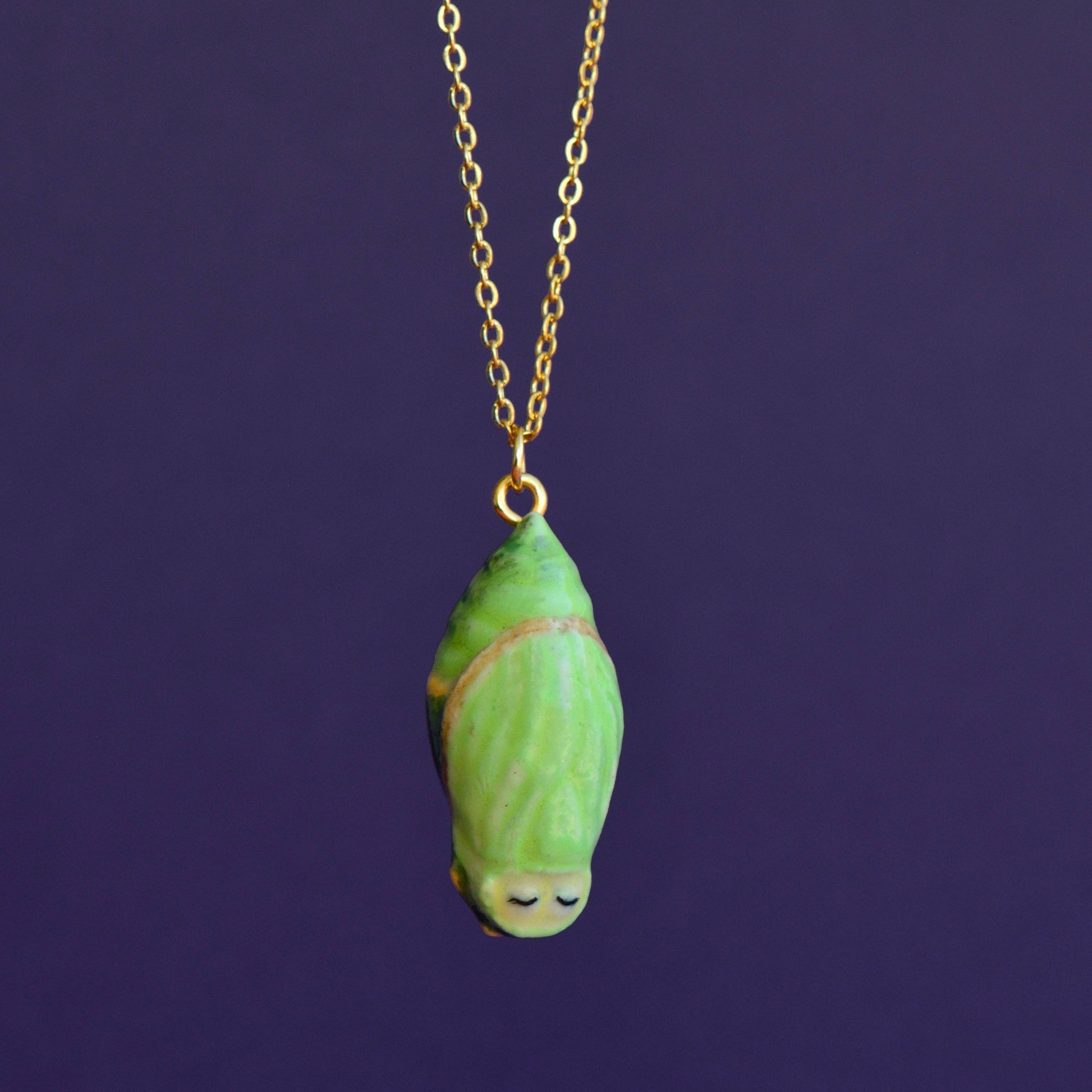Experience the magic of transformation with this Chrysalis Necklace. This hand-painted porcelain pendant embodies the essence of spring and the beauty of life's transitional moments. Brilliantly green and exuding serenity, it's a celebration of nature's miracles. Due to the handmade nature of this product, slight variations in color and design may occur, making each piece truly one-of-a-kind. Ideal for those who appreciate the wonder and intricacy of nature's cycles.