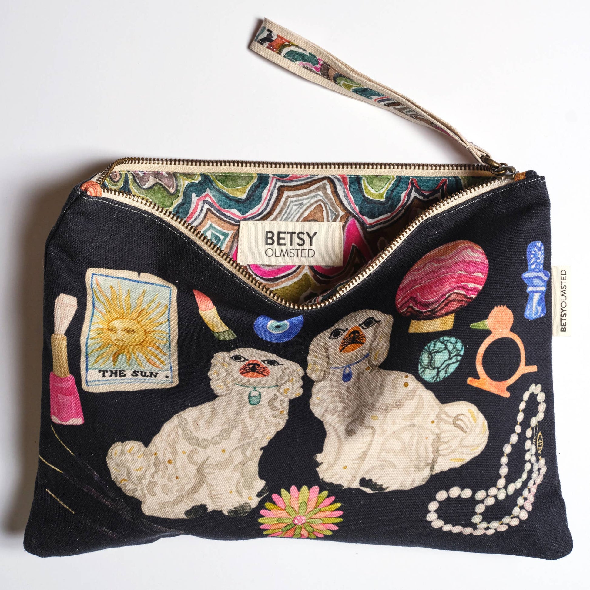 Featuring Betsy's original designs, these clutches are double sided and contain a happy surprise print on the inside! Carry inside a larger bag or on it's own as a conversational accessory. These durable pieces are small batch made in India.