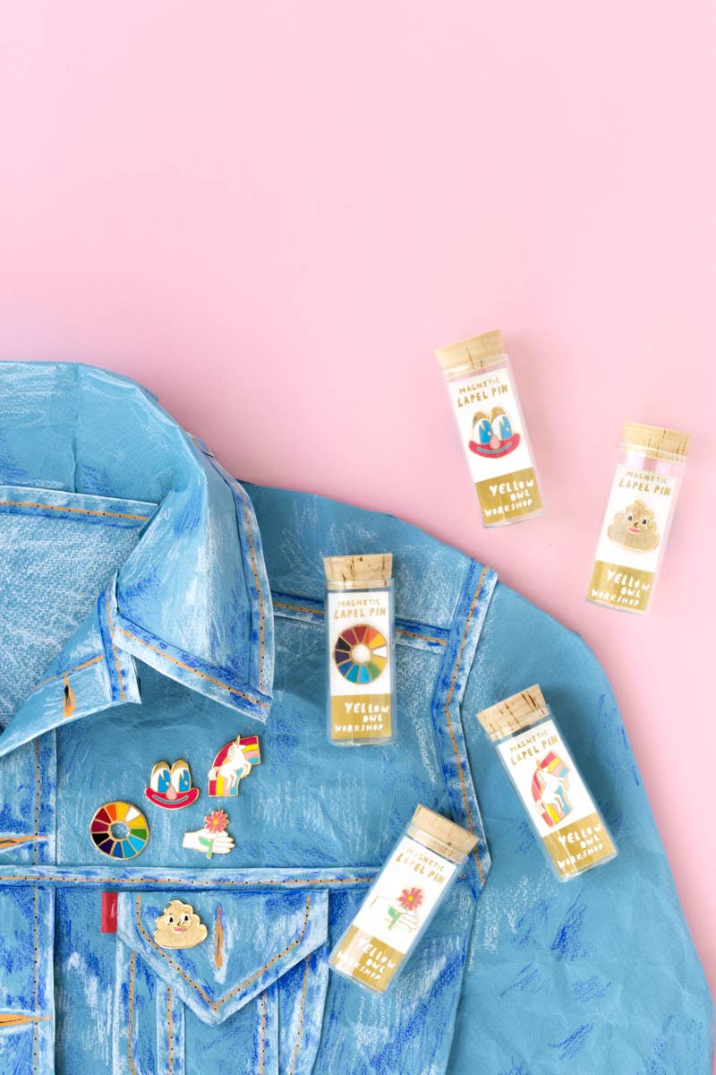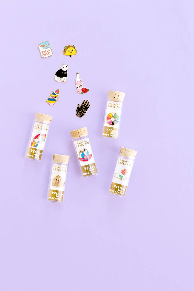 This luxury-quality 22-karat gold gilt lapel pins are decked with vivid cloisonné colors and have a magnetic backing. Delicate enough (and damage-free!) for your favorite tops but with magnetic strength that allows them to be worn on even heavy-weight denim. Comes packaged in our unique glass vial packaging with cork. Each pin is slightly smaller than 1" (2.5 cm).