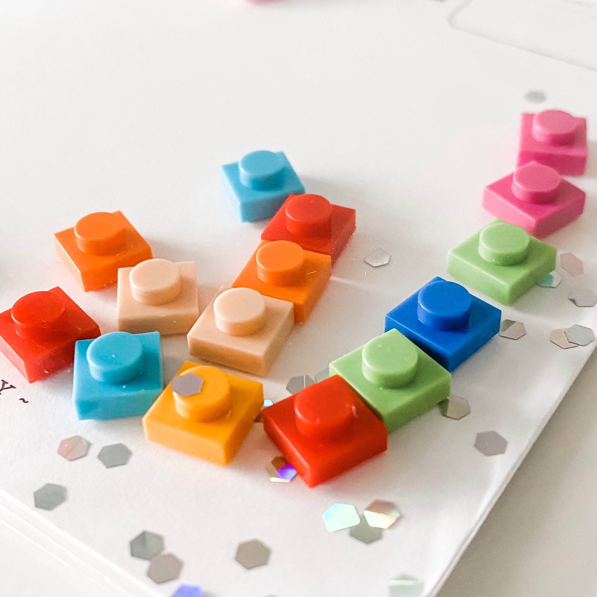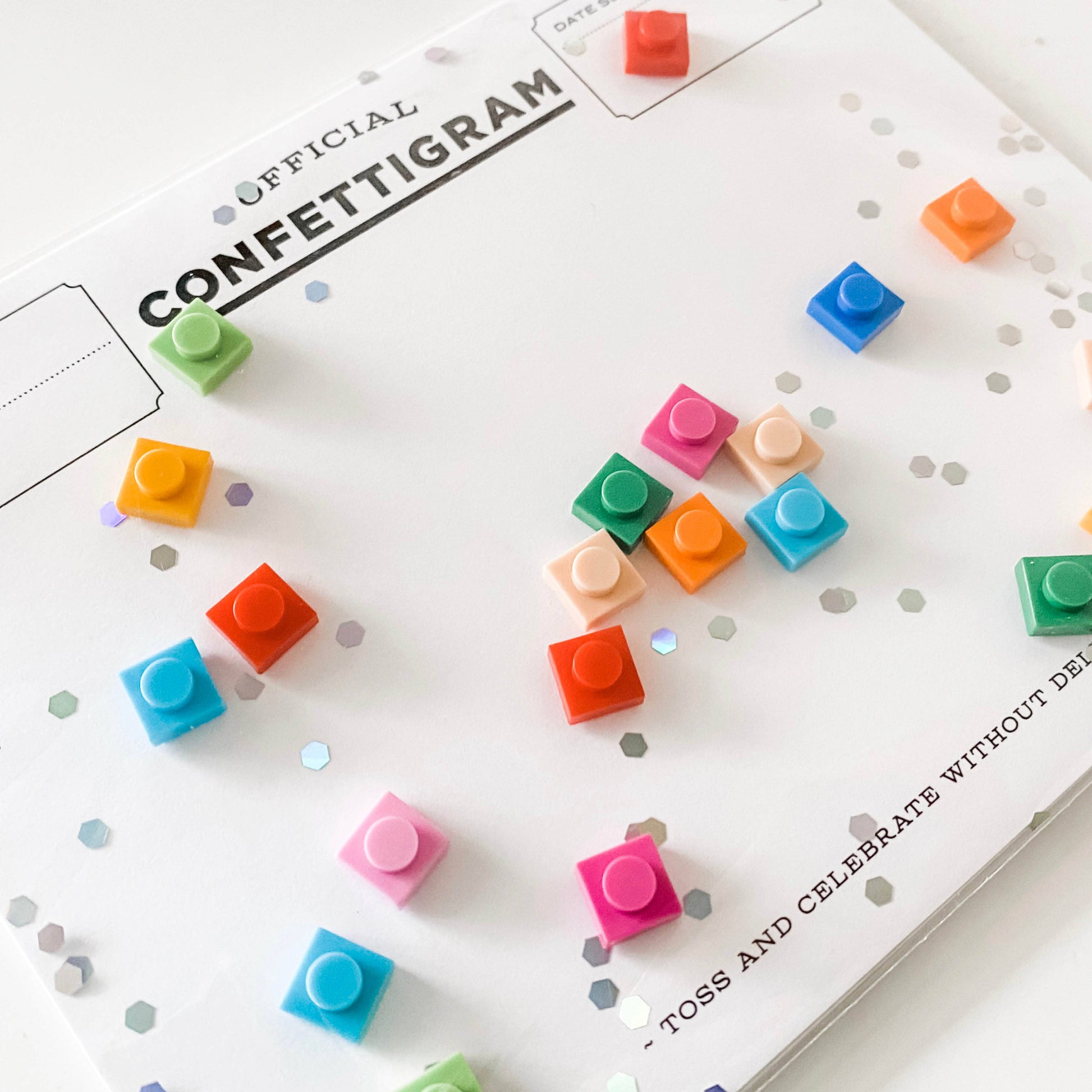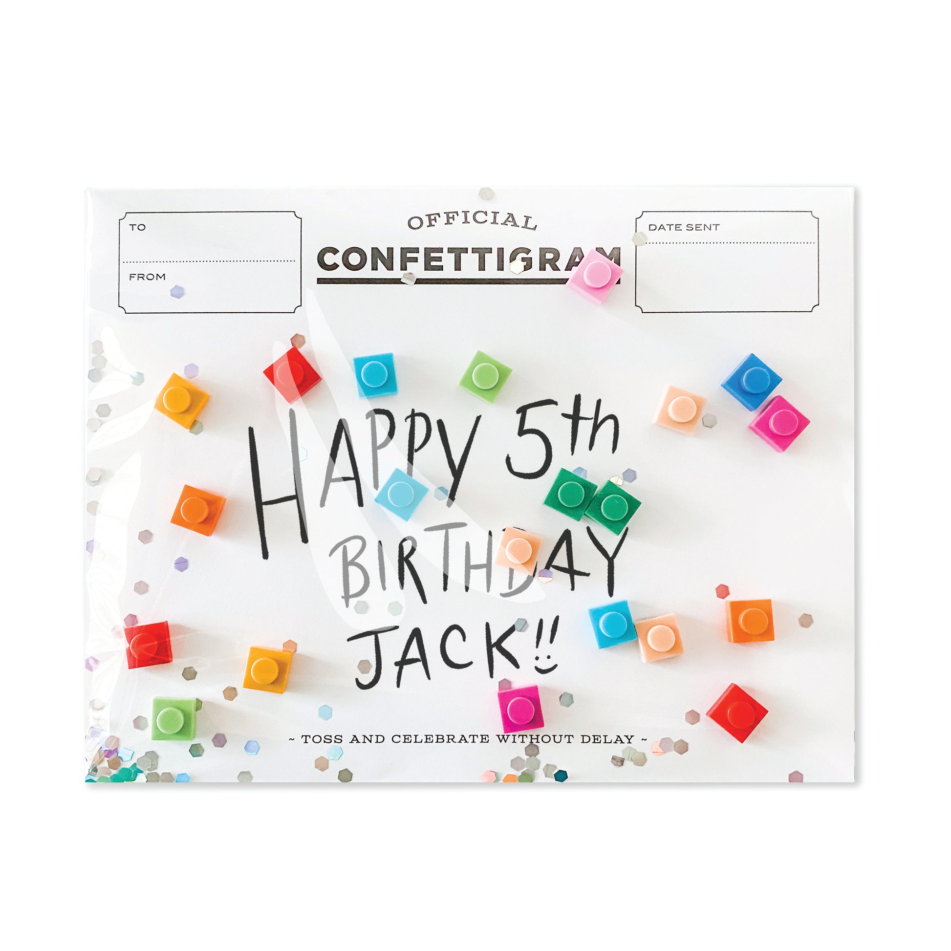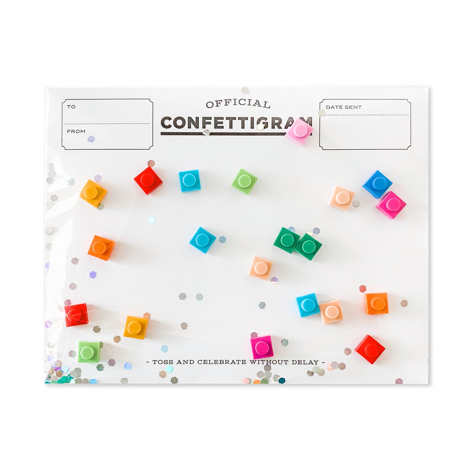 Confettigrams come packed full of fun. This clear envelope contains a folded card with hand-mixed metalic confetti and mini building bricks that float around your message. Instructions: Remove the card. Save the clear envelope. (Yes, that’s the mailing envelope!) Carefully pour out confetti and set aside. Write message on front. Address the back. Return card to envelope. Pour confetti over your message, keeping the address clear. Seal it. Stamp it. Mail it. *Extra postage required. We recommend a non-machinable stamp be used when mailing.