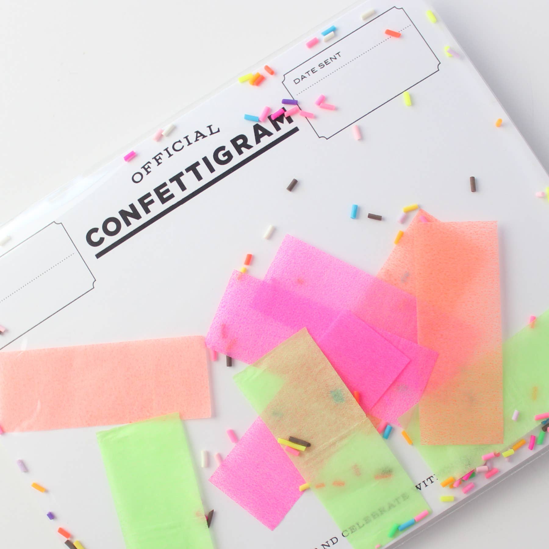 This Sprinkles Confettigram comes filled with the brightly colored confetti and resin sprinkles that will float around your message! Not Edible. Do Not Eat. Instructions: Remove the card. Save the clear envelope. (Yes, that’s the mailing envelope!) Carefully pour out confetti and set aside. Write message on front. Address the back. Return card to envelope. Pour confetti over your message, keeping the address clear. Seal it. Stamp it. Mail it. *Extra postage required. We recommend a non-machinable stamp be used when mailing.