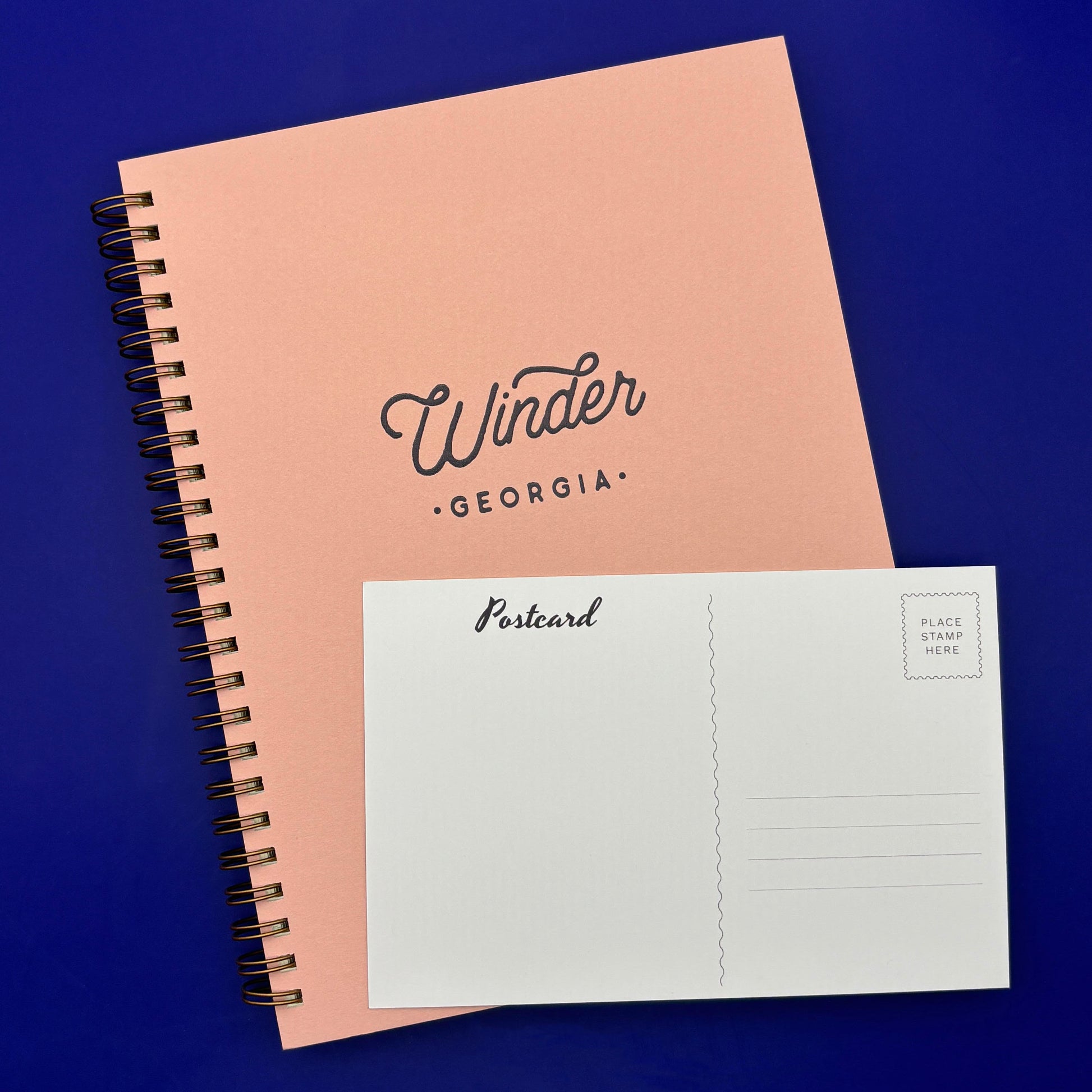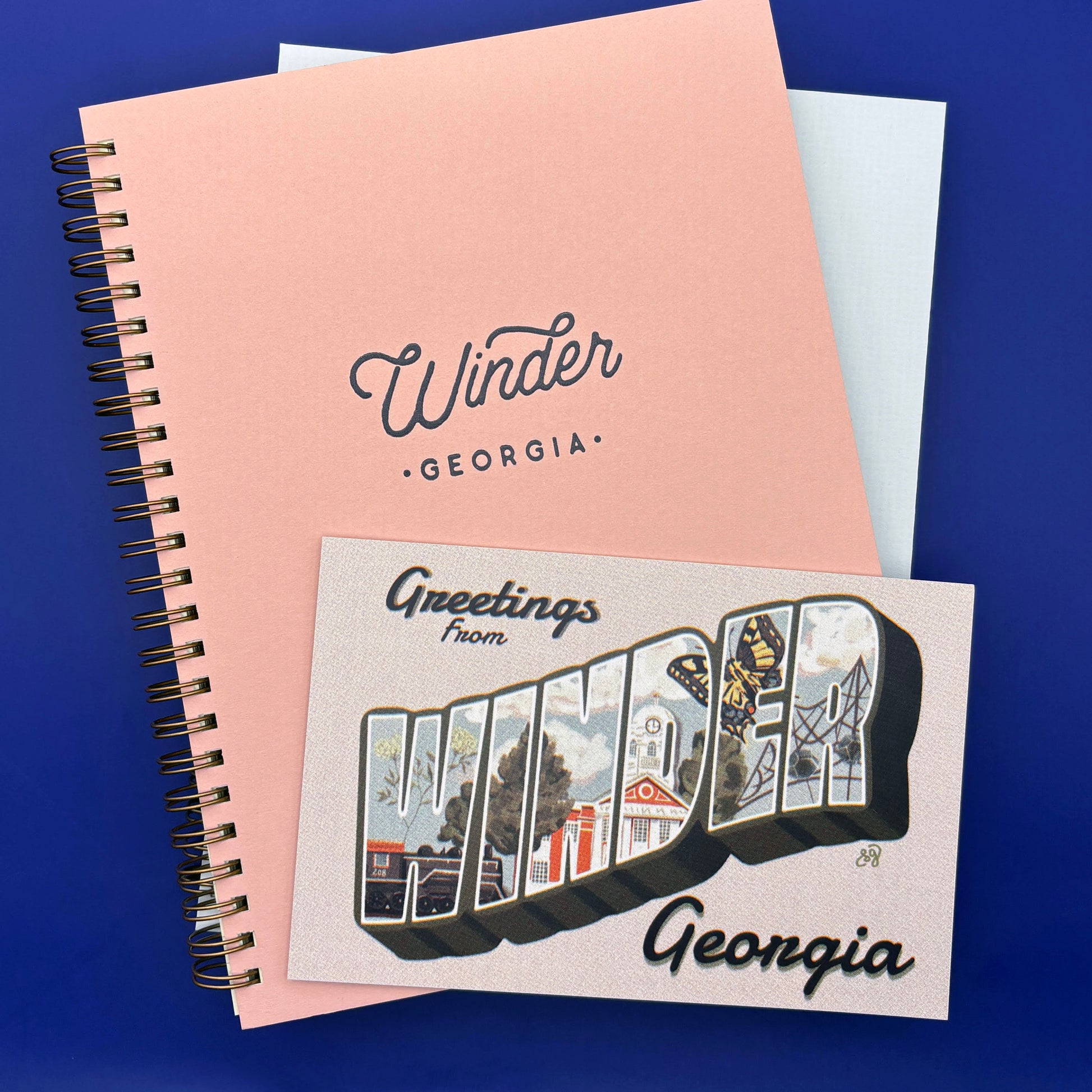 Greetings from Winder, Georgia. Postcard measures 6" x 4" and is printed on thick card stock with a matte finish. Scenes pictured include a train, city hall, a butterfly, and a park net.