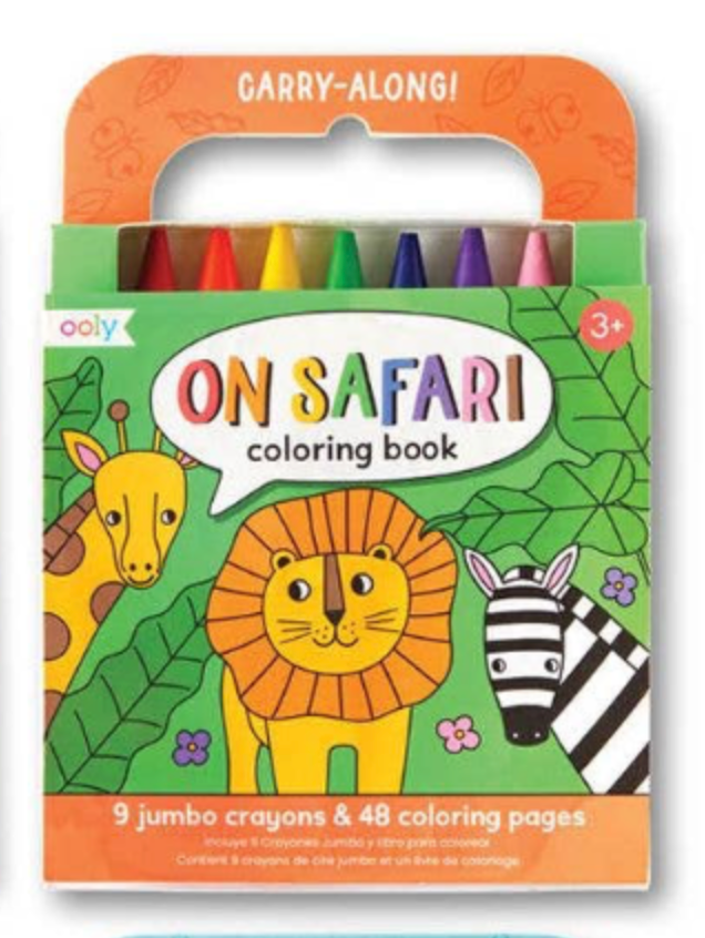 A fun carry along coloring book, perfect for traveling with little ones. Explore a safari with this fun coloring book by Ooly. 9 Jumbo crayons and 48 coloring pages all together in a cardboard case.