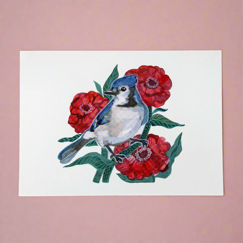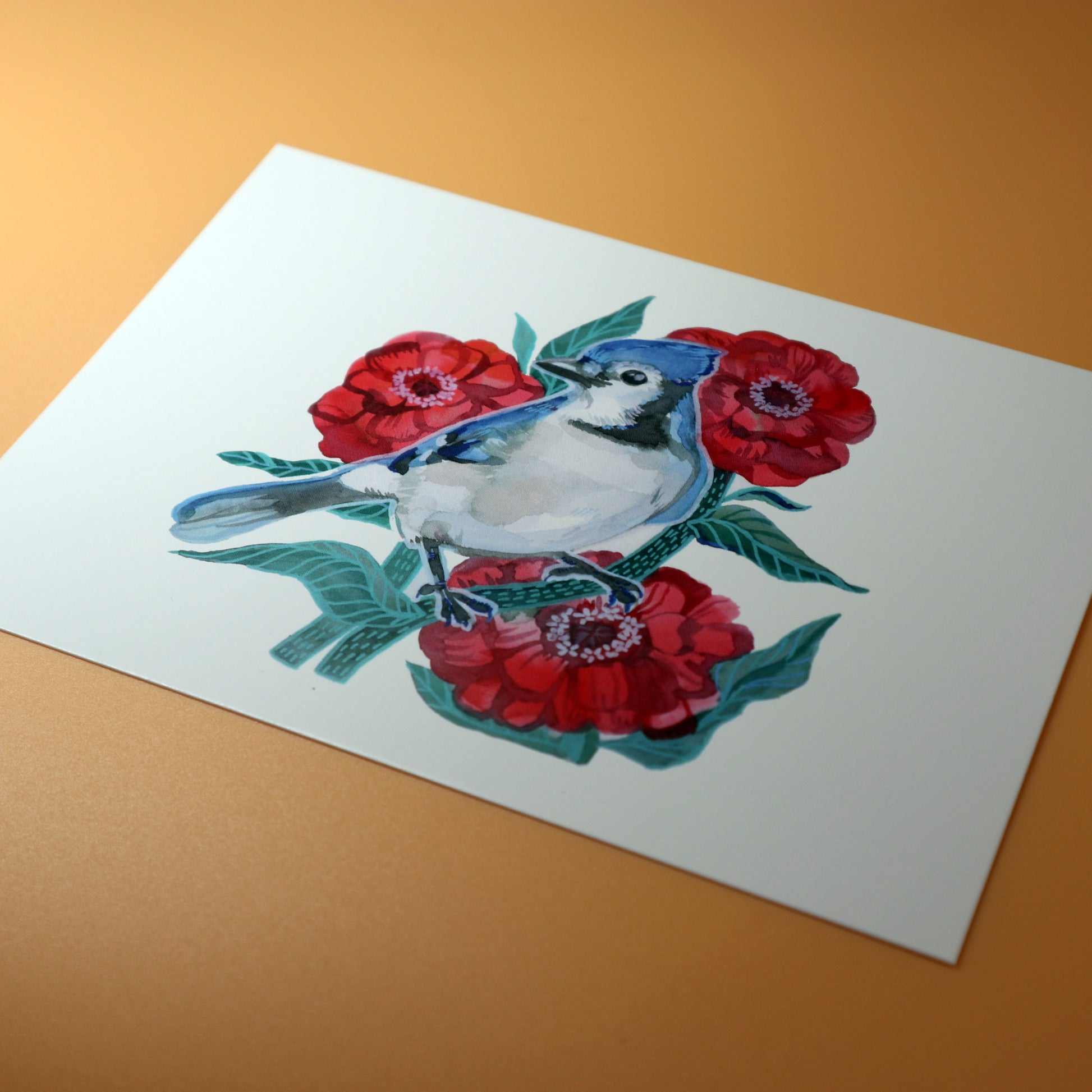 Print of blue bird and flowers measures 5"x7" and is printed on thick cardstock with a glossy finish. Perfect for framing, or even sending as an oversized postcard.