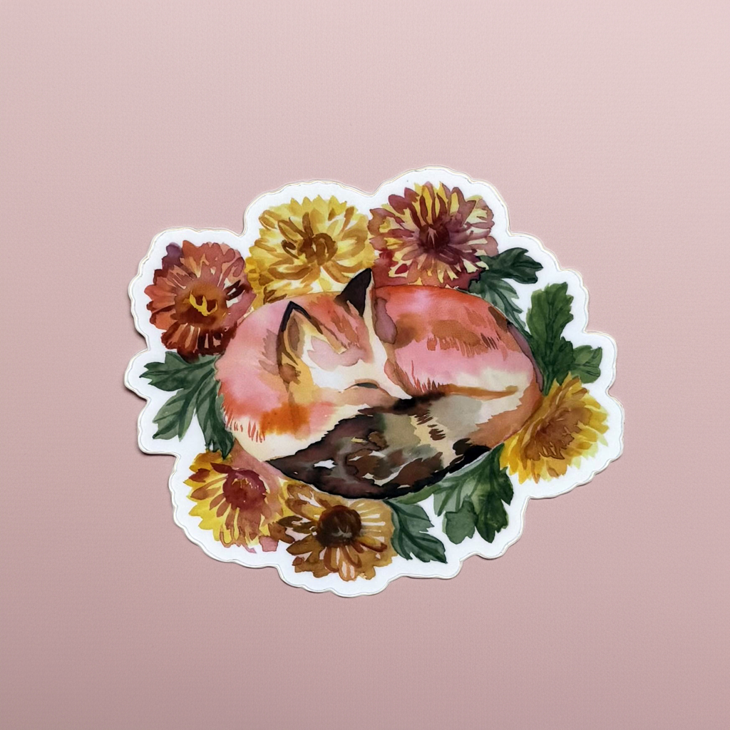 Vinyl sleeping fox sticker measures 4" x 3.25". Sleeping fox also available as a 5x7 fine art.