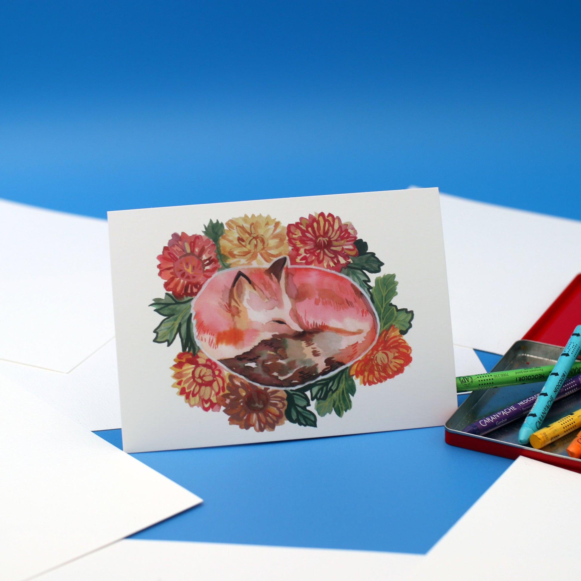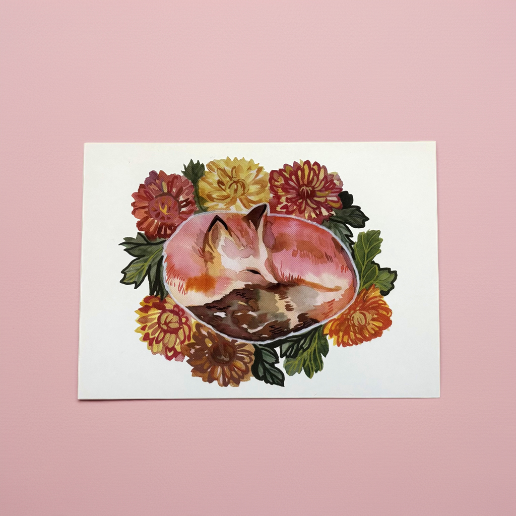 Introducing Art Print "Sleeping Fox" (5x7") - Made with love by Shellie. This quirky design features a snoozing fox on glossy cardstock, ready to frame or send as a supersized postcard. You can even get it as a vinyl sticker!