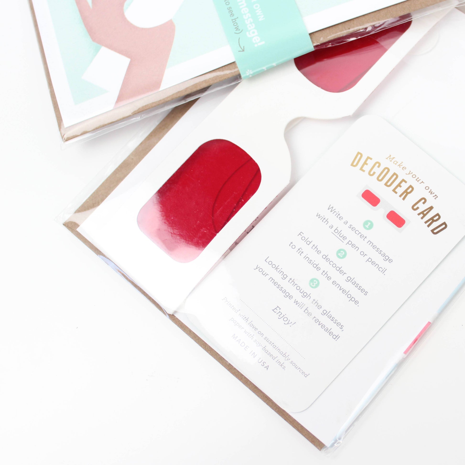 Hide a secret message with the Spyglass Decoder Card that can ONLY be seen by looking through the decoder glasses! Write lightly with a pencil or blue pen, then peek through the red decoder glasses to reveal your hidden message! A fun card to send for parties, anniversaries, birthdays or really any occasion.