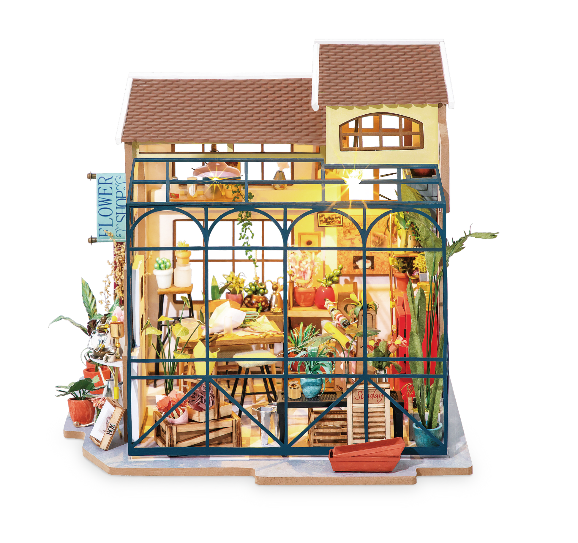 Flower Shop, DIY Miniature House Kit. Whether this is your first 3D dollhouse puzzle or you are looking to expand your already existing craft collection, you’ve come to the right place. This tiny dollhouse Flower Shop will keep you busy as you design and create the perfect little space. Kids and adults alike will enjoy this 3D wood puzzle. To make these rooms look as realistic as possible, light fixtures are included with tiny LED bulbs to illuminate each little room. This vibrant and cozy lighting will add the finishing touch to your room, table, shelf, or showcase. Comes with an instruction book with illustrations to give you an idea of the possibilities. This dollhouse kit comes equipped with all the materials and tools you need to recreate furniture and much more to give you a detail-oriented and well-furnished feel to your tiny space. (Glue included)