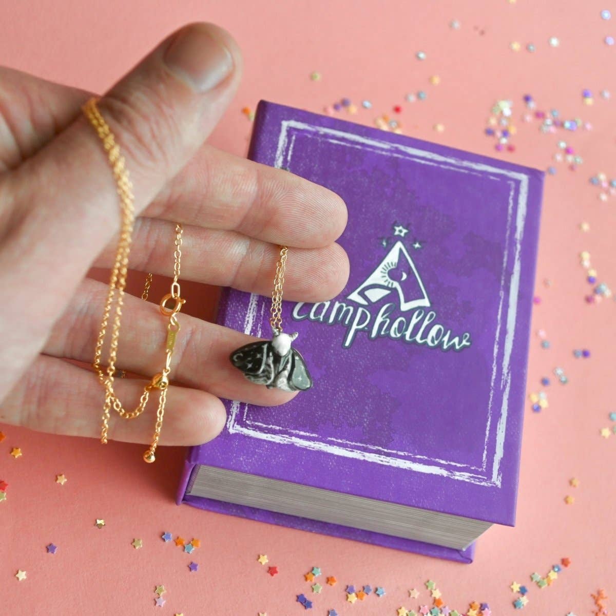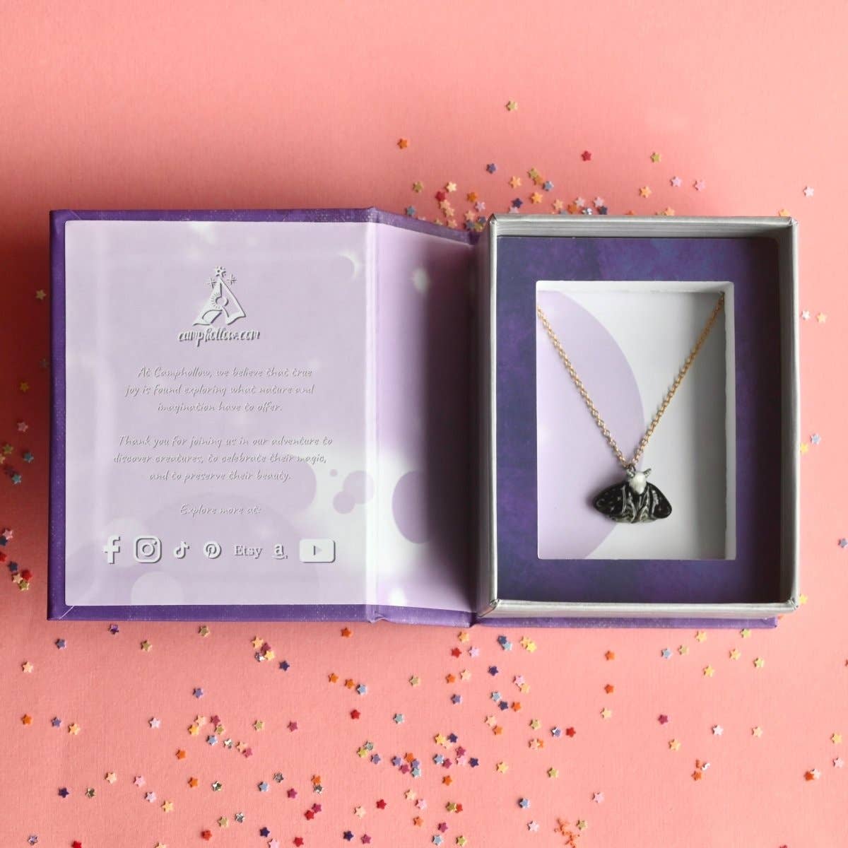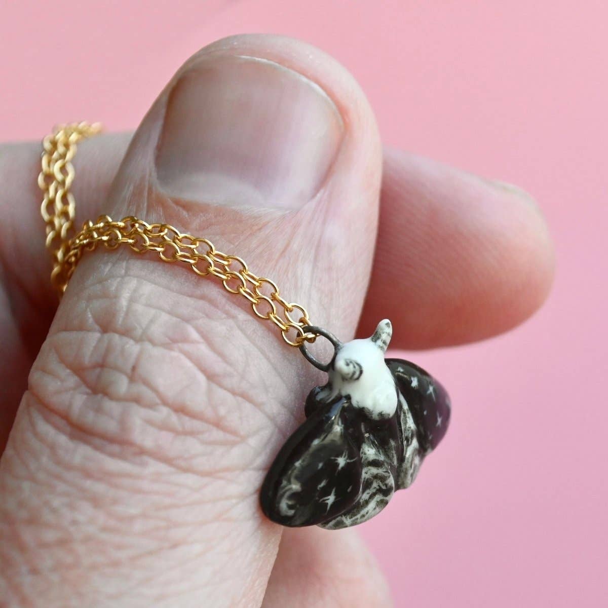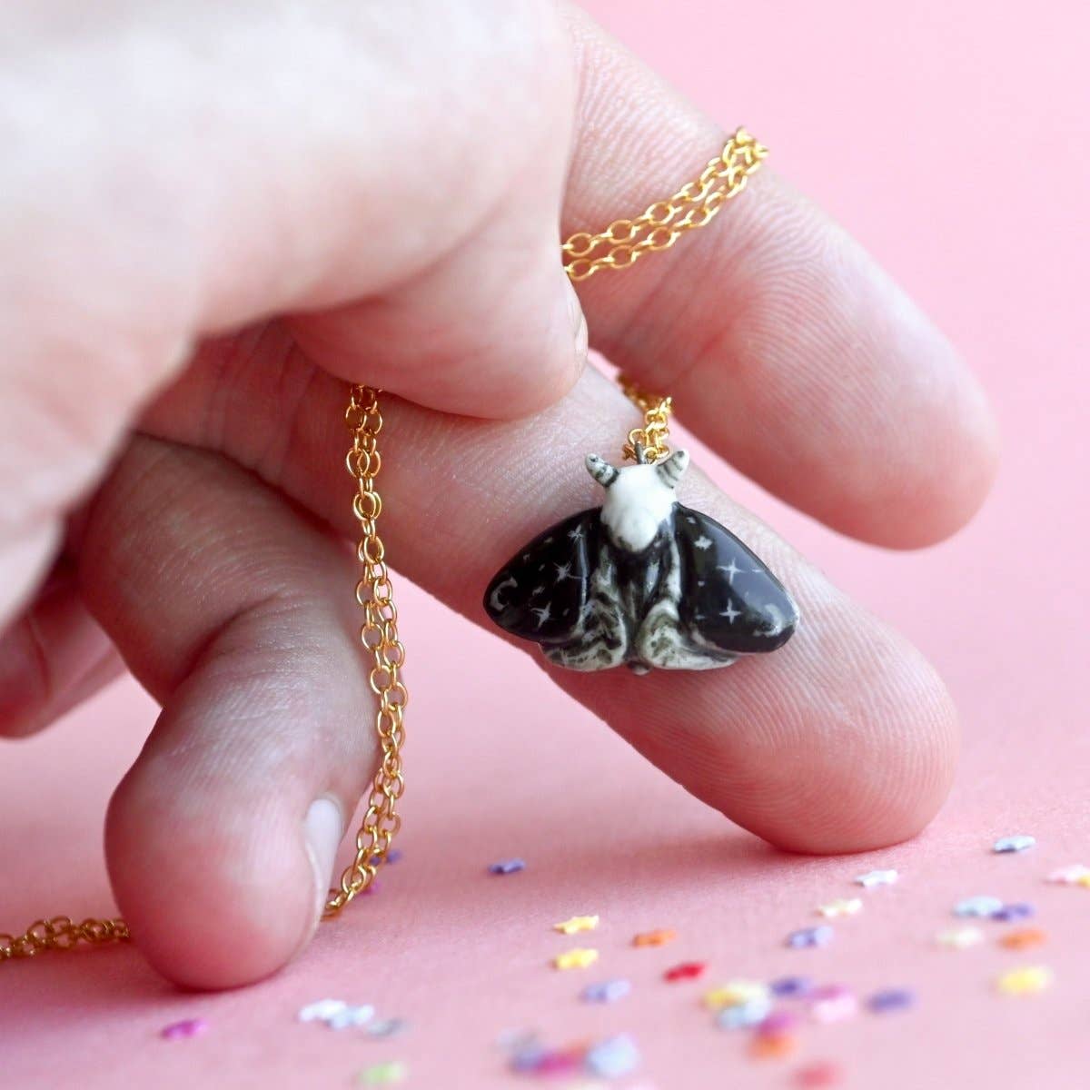 Unlock the mysteries of the night with our limited-edition Dream Moth Necklace! This handcrafted porcelain pendant features a moth adorned with stars and crescent moons on its wings, weaving a celestial narrative that enchants and captivates. Suspended on a premium gold chain, this necklace adds a touch of ethereal elegance to any ensemble, from casual to formal. Due to the handmade nature of this product, slight variations in color and design may occur, making each piece truly one-of-a-kind. Maintenance is effortless—a quick wipe with a damp cloth keeps your pendant looking as mesmerizing as the night sky. Packaged in a storybook jewelry box, this necklace is the perfect gift for dreamers, stargazers, or anyone who appreciates the blend of fashion, artistry, and a sprinkle of cosmic wonder.