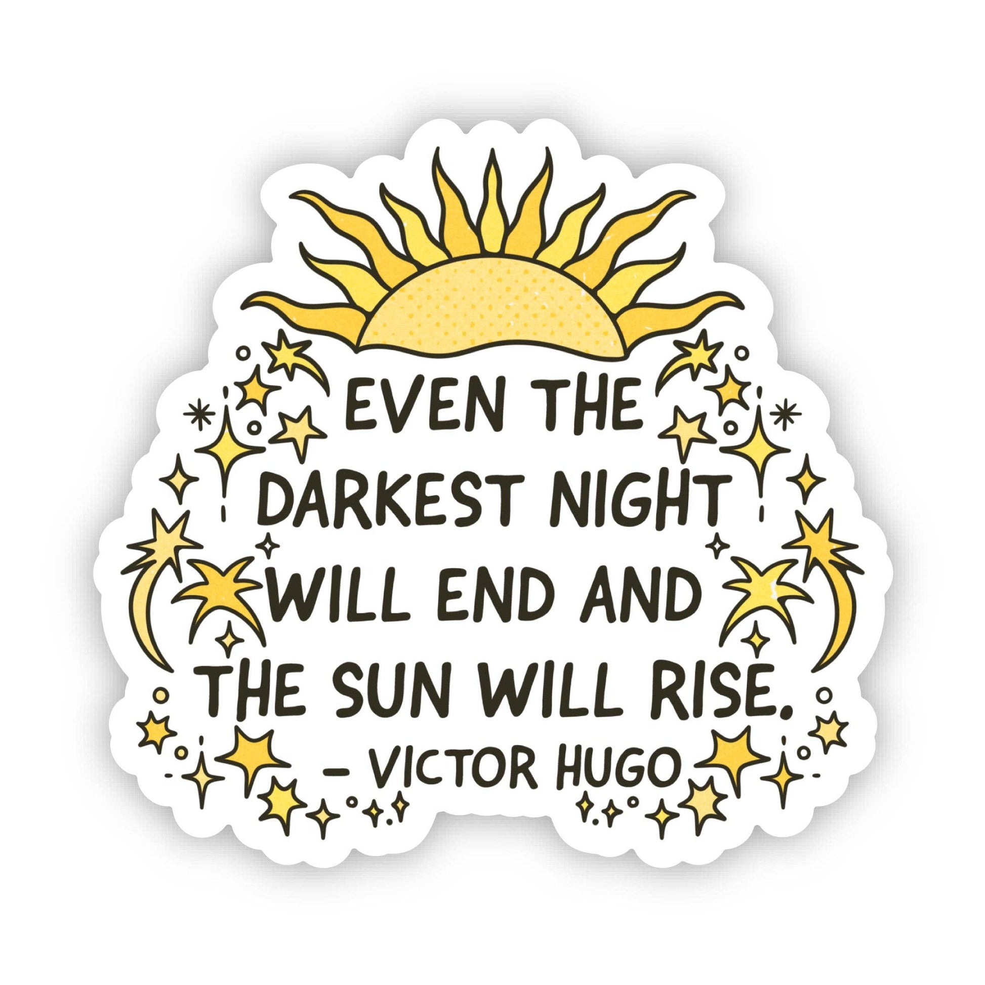 Keep hope alive with this Victor Hugo quote sticker that reminds you "even the darkest night will end and the sun will rise". High quality vinyl sticker. Great to decorate laptops, water bottles, car windows, coolers, suitcases, bikes, kayaks, phone cases, journals, and more.