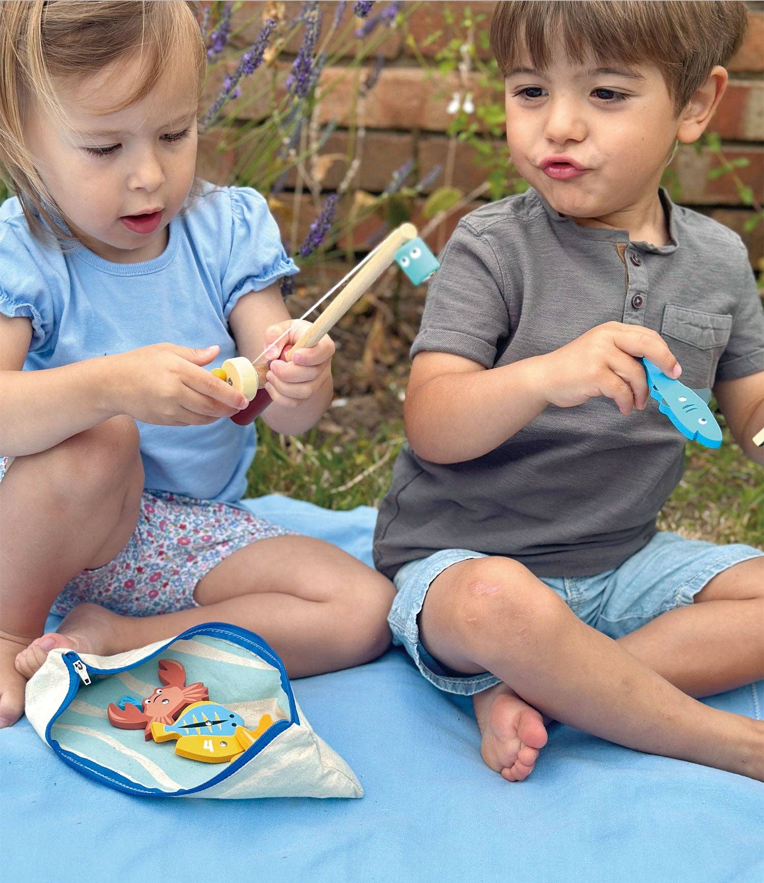 This fishing game toy includes a wooden fishing rod with magnetic end to attract 7 sea creatures. All held in a zipped pencil case-styled bag with blue wave interior. A starfish, a crab, a shark, a flat fish, a herring, a cod and a mackerel, all with numbers printed on the back.