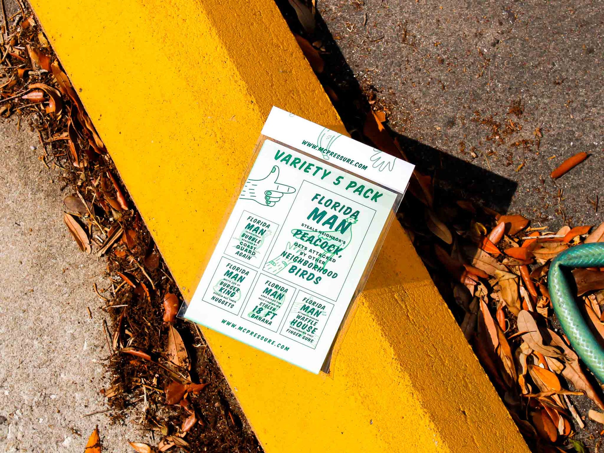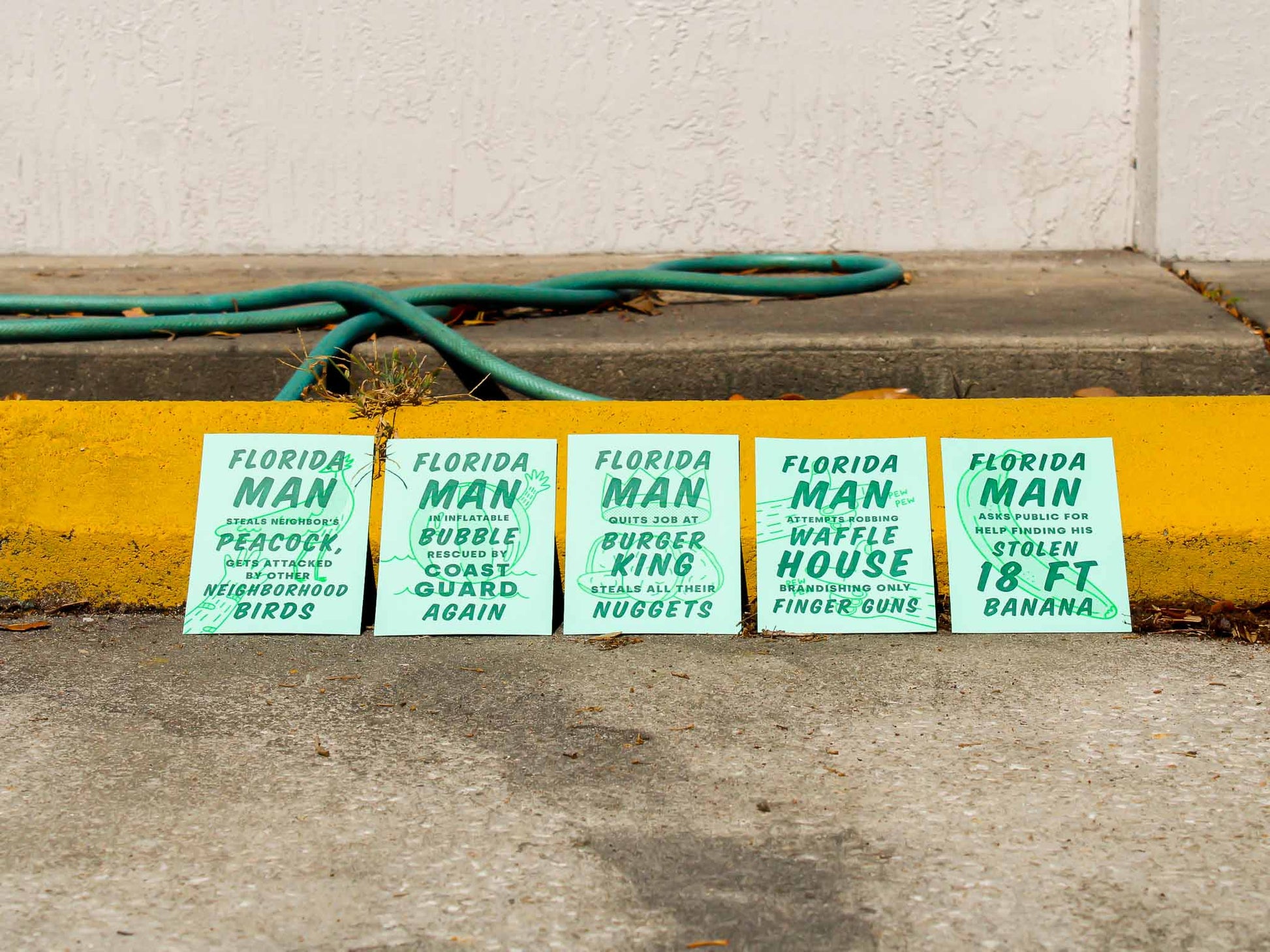 - Pack Includes: Florida Man Steals Neighbors’s Peacock, Gets Attacked By Other Neighborhood Birds; Florida Man In Inflatable Bubble Rescued By Coast Guard Again, Florida Man Quits Job At Burger King, Steals All Their Nuggets, Florida Man Asks Public For Help In Finding His Stolen 18 FT Banana, Florida Man Attempts Robbing Waffle House Brandishing Only Finger Guns.
