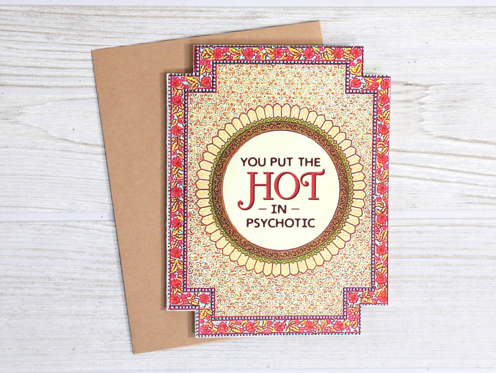 A funny vintage-inspired greeting card. "You Put the Hot in Psychotic"