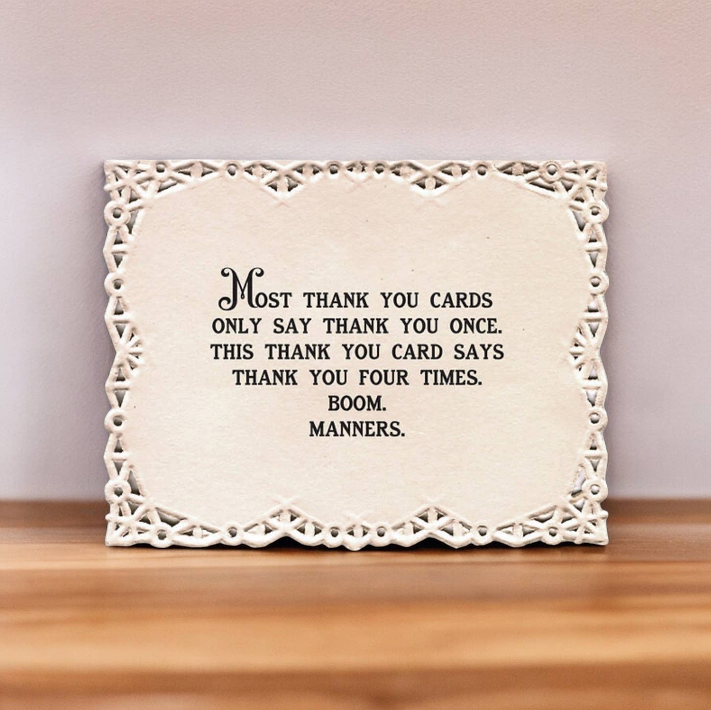 Most Thank You Cards Only Say Thank You Once - Funny Vintage Greeting. Be an overachiever and send this vintage-inspired thank you card: "Most thank you cards only say thank you once. This thank you card says thank you four times. Boom. Manners."