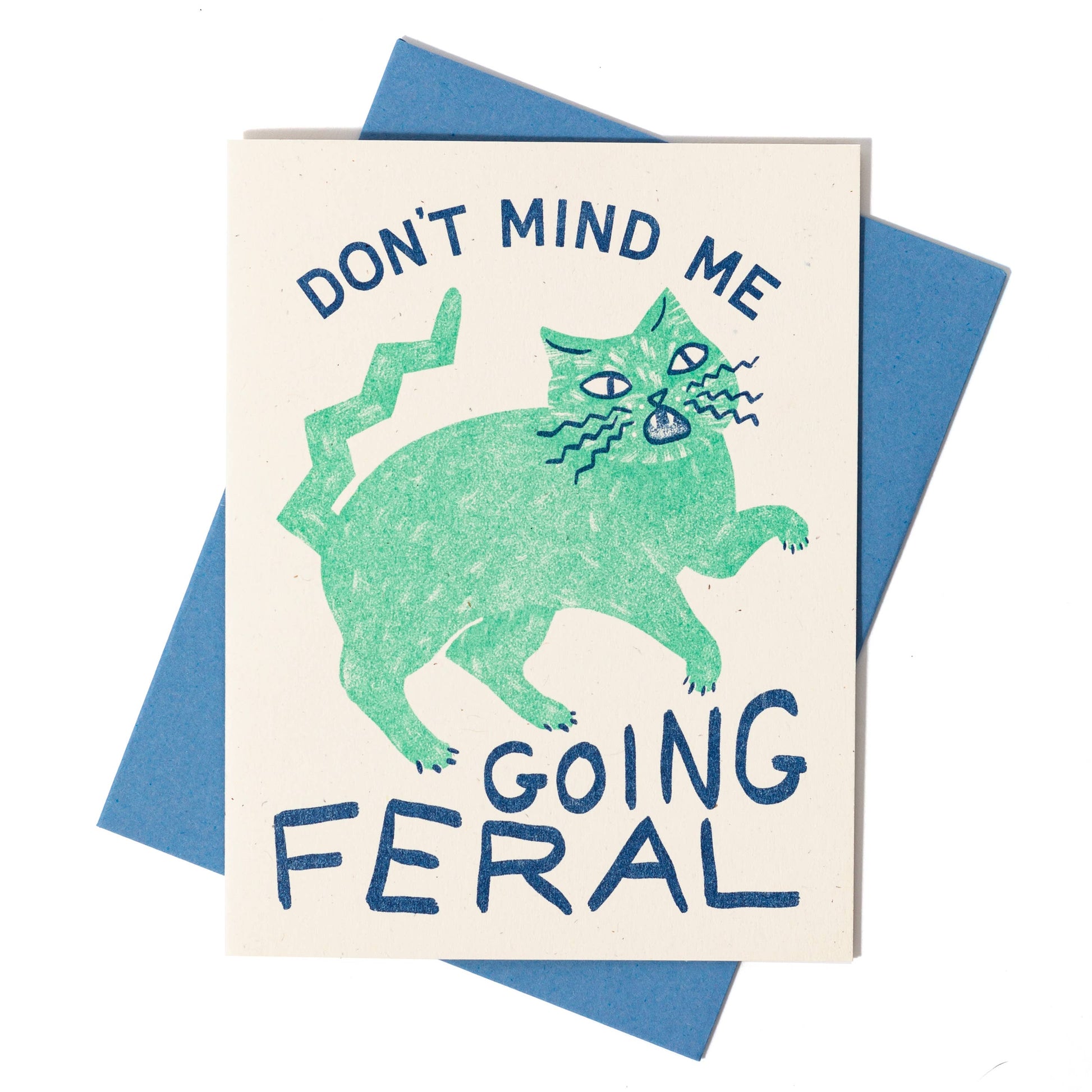 Things feeling a little chaotic? Don't mind me, just going feral—like this cat! Risograph printed in seafoam and federal blue.