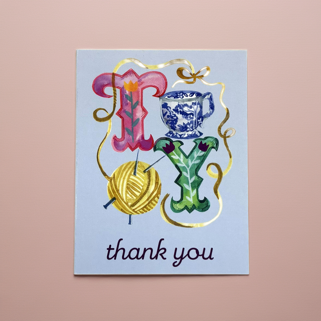 Made by Shellie print of a cup of tea and two knitting needles in yarn, the letters T Y over the words thank you. Includes kraft A2 envelope.