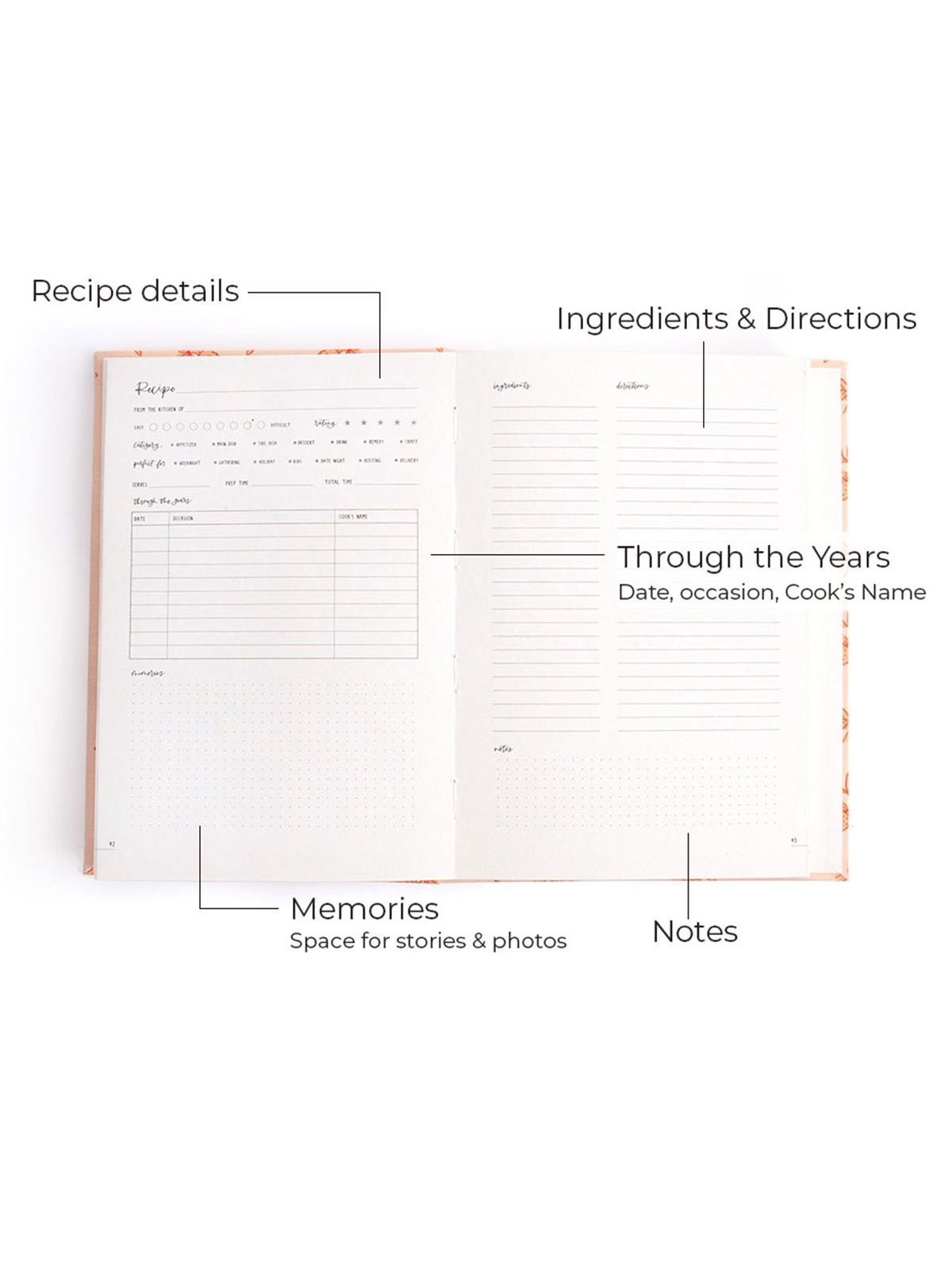- 58 detailed recipe pages with sections for Ingredients, Instructions, Memories, Through the Years, Notes and more.