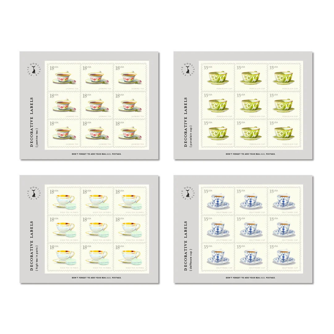 Add a touch of whimsy to your mail or parcels with these Decorative Labels. Inside, you'll find four sheets, each with nine peeling labels for all your needs. And scrapbookers, these are a dream come true! The High Tea collection includes four fabulous tea cups called: Jasmine Tea, Porcelain Cup, High Tea in Paris, and Delftware Cup. Reminder: These are decorative. Real postage must be used when mailing.