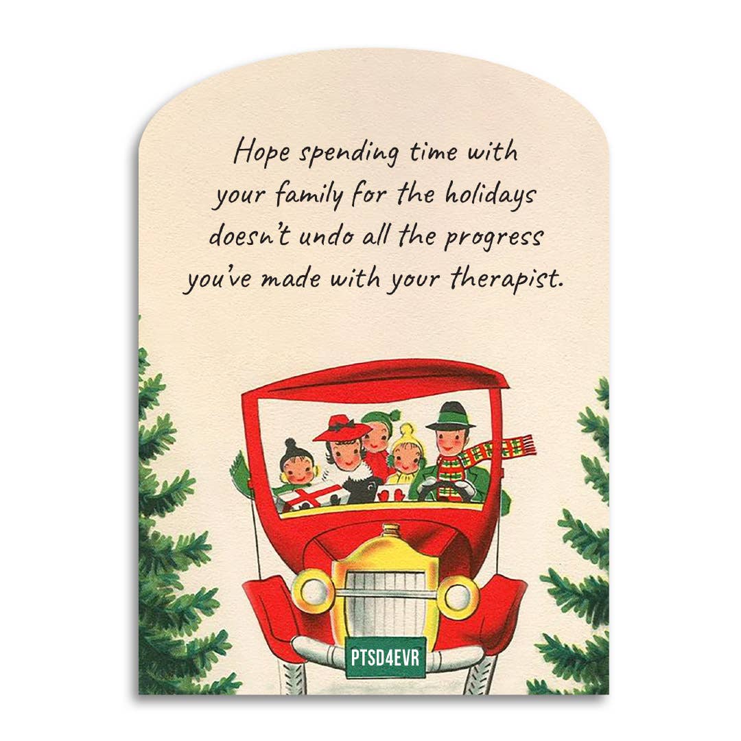 Hope Spending Time With Your Family for the Holidays... Irreverent Card. Celebrate the holiday season with a little bit of dark humor with this "Hope spending time with your family for the holidays doesn't undo all the progress you've made with your therapist" card. Featuring a vintage illustration, this card playfully acknowledges the challenges that family gatherings can present.
