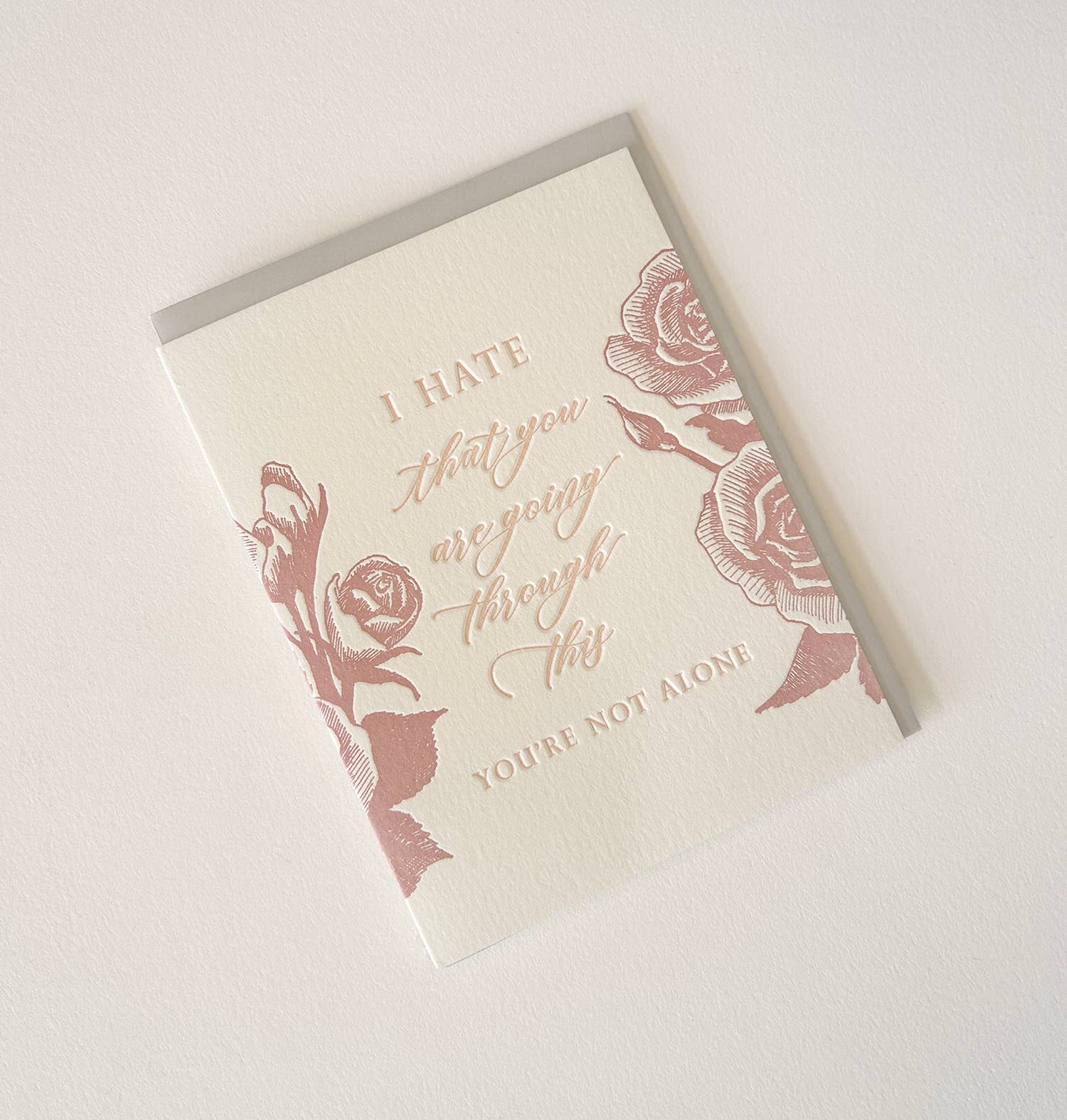 "I Hate That You're Going Through This" Let someone going through something hard know they're not alone with this sentimental card. Original floral artwork created by Rust Belt Love. These two color cards are handmade and pressed one at a time on antique presses. Premium quality cotton paper.