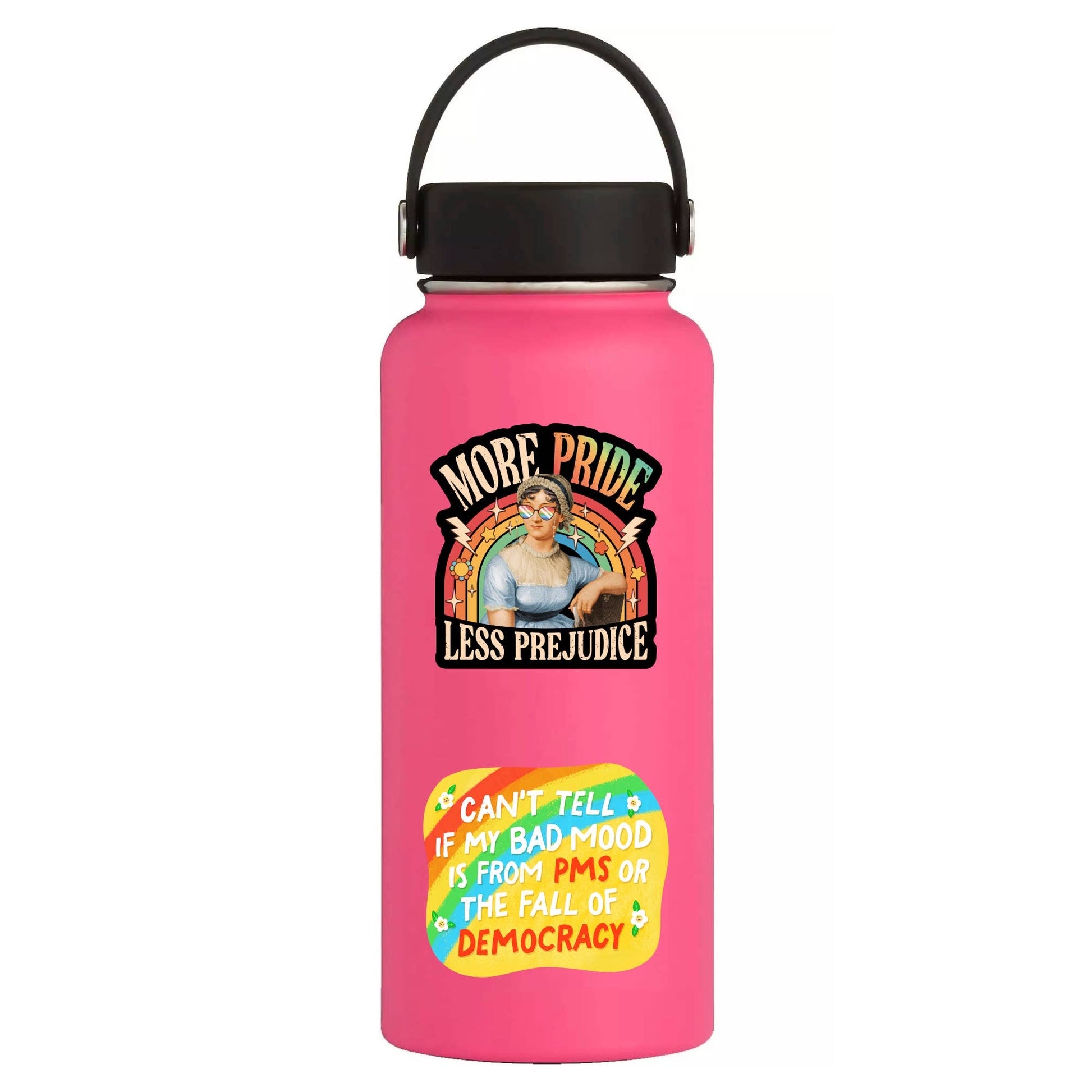 Add a pop of personality to your laptop, water bottle, or phone case. This vinyl sticker features Jane Austin wearing sunglasses with the words More Pride Less Prejudice above and below her. Measures 3"x 2.5"