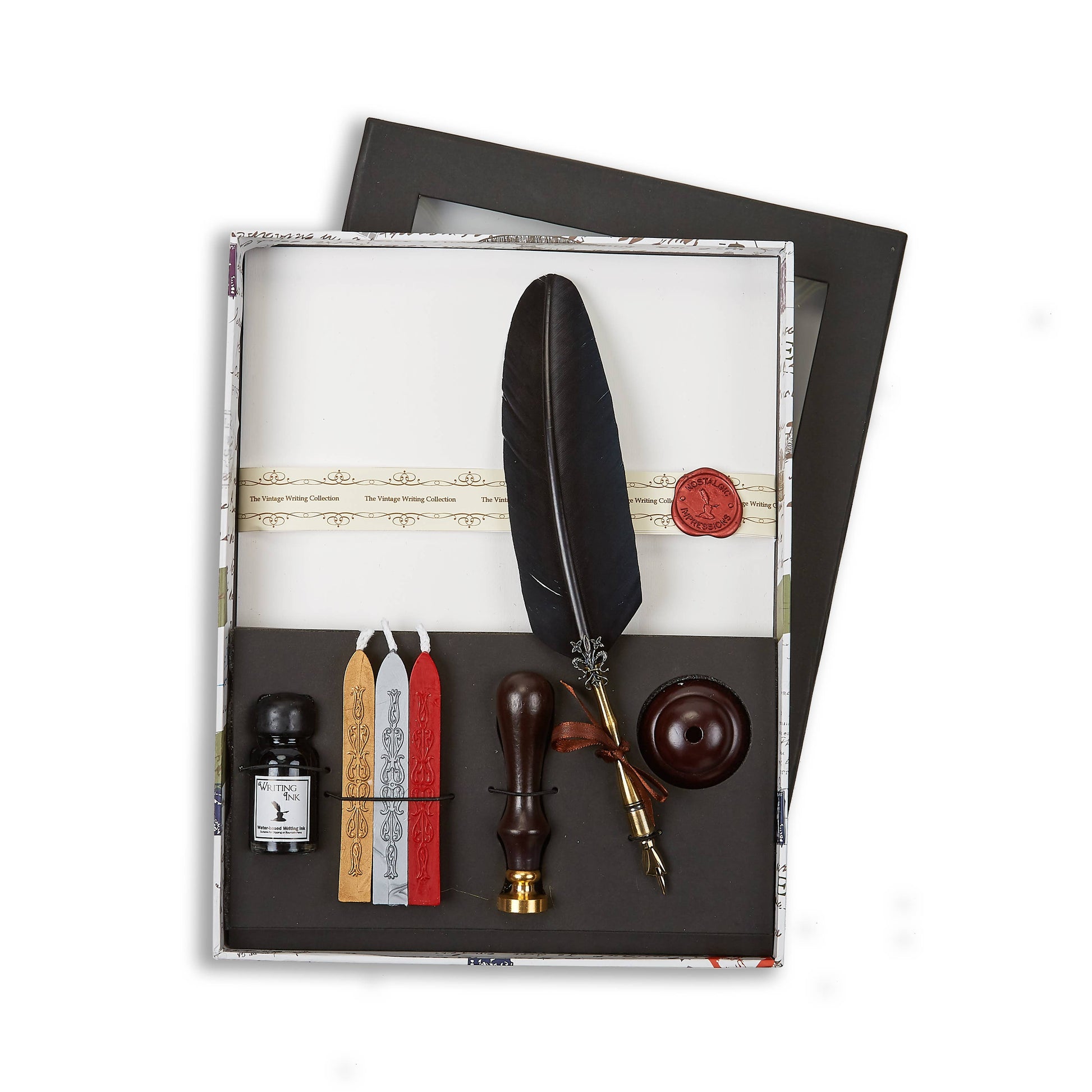 A classic Writing Set by Freund Mayer & Co. This set combines all of the must-have writing products: 1 Feather Quill Nib Pen with Brass Handle, 1 Apothecary Jar of Black Ink, 1 Pack of Parchment Paper Note cards & Envelopes, 1 Compass Rose Seal Stamp with Wood handle, 3 sticks of flexible Sealing Wax, and a Wax Seal Instruction Booklet.