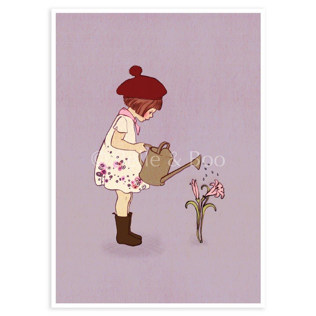 This A6 postcard features a little girl watering her plants. Purple hues and vintage greens adorn the design. Perfect for Mother day or just to say thank you this postcard is so charming it will bring a smile to anyone that receives it.