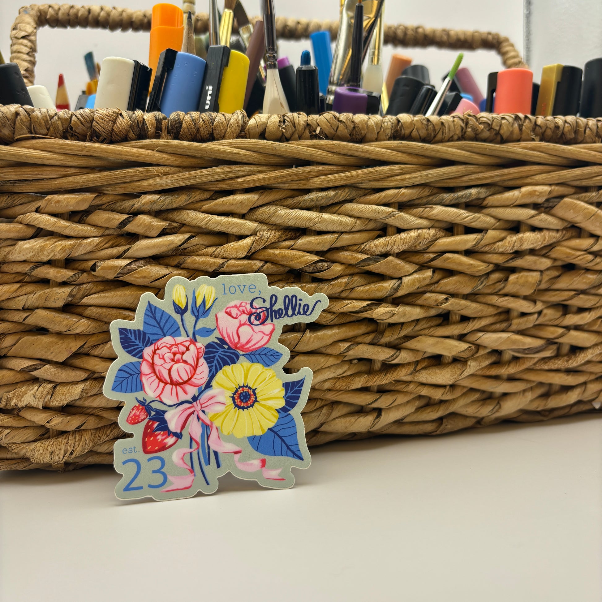 We always receive so many compliments on the murals that Shellie has designed and created for the shop so she has created these beautiful stickers so that you may have a piece of the shop to take home. This Love, Shellie floral sticker is made of matte vinyl and is die-cut to ensure no peeling or fraying. These stickers are waterproof and dishwasher safe, perfect to adorn your favorite water bottle, lap top, and more!