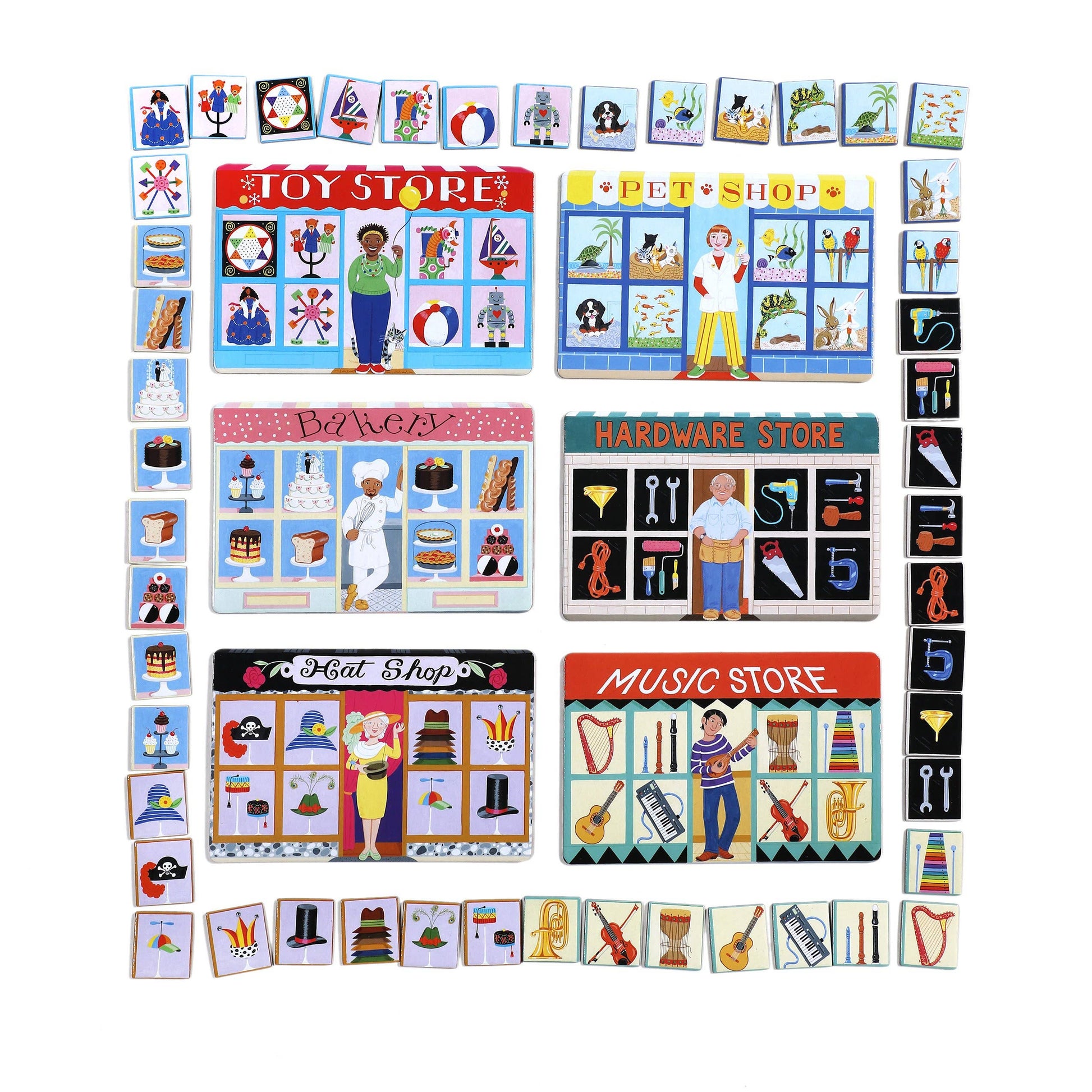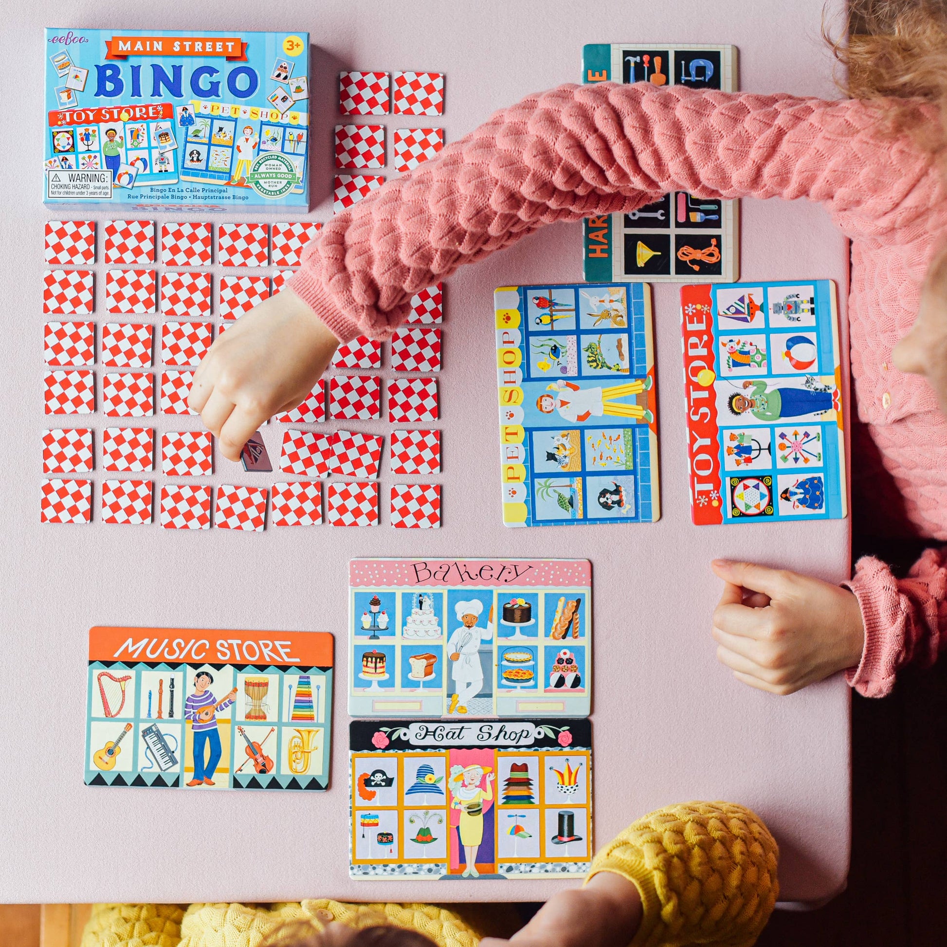 Main Street Bingo is a fun twist on the classic bingo game. The six playing boards feature charming storefronts from Main Street and their friendly owners. The first player to match all the tiles to their board and fill their store wins the game. Illustrated by Lizzy Rockwell.