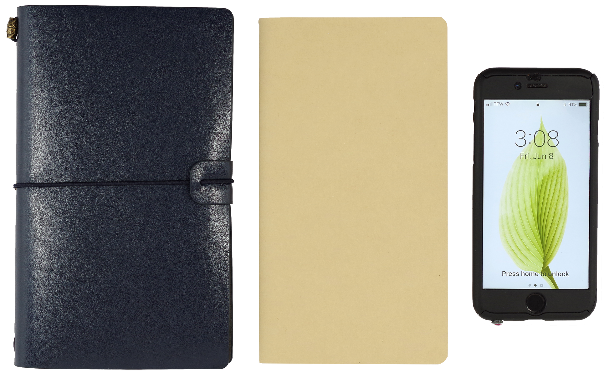 On the inside: 3 separate 60-page notebook inserts: A Lined Pages insert A Dot-Grid/Dot Journal Pages insert A blank Kraft Paper Pages insert Plus: A clear storage pocket inside the front cover. A clear zippered storage pouch inside the back cover. Interior stretchbands, elastic closure, and protective front-edge flexi-tab to keep it all together.