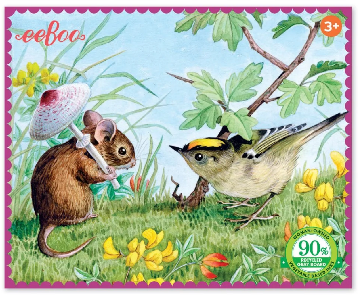 Mushroom Umbrella: Embark on a pocket-sized adventure with eeBoo’s Mini 36 Piece Jigsaw Puzzles. This puzzle features an afternoon chat between a mouse and a neighboring bird. With artwork from Angus Clifford Racey Helps.