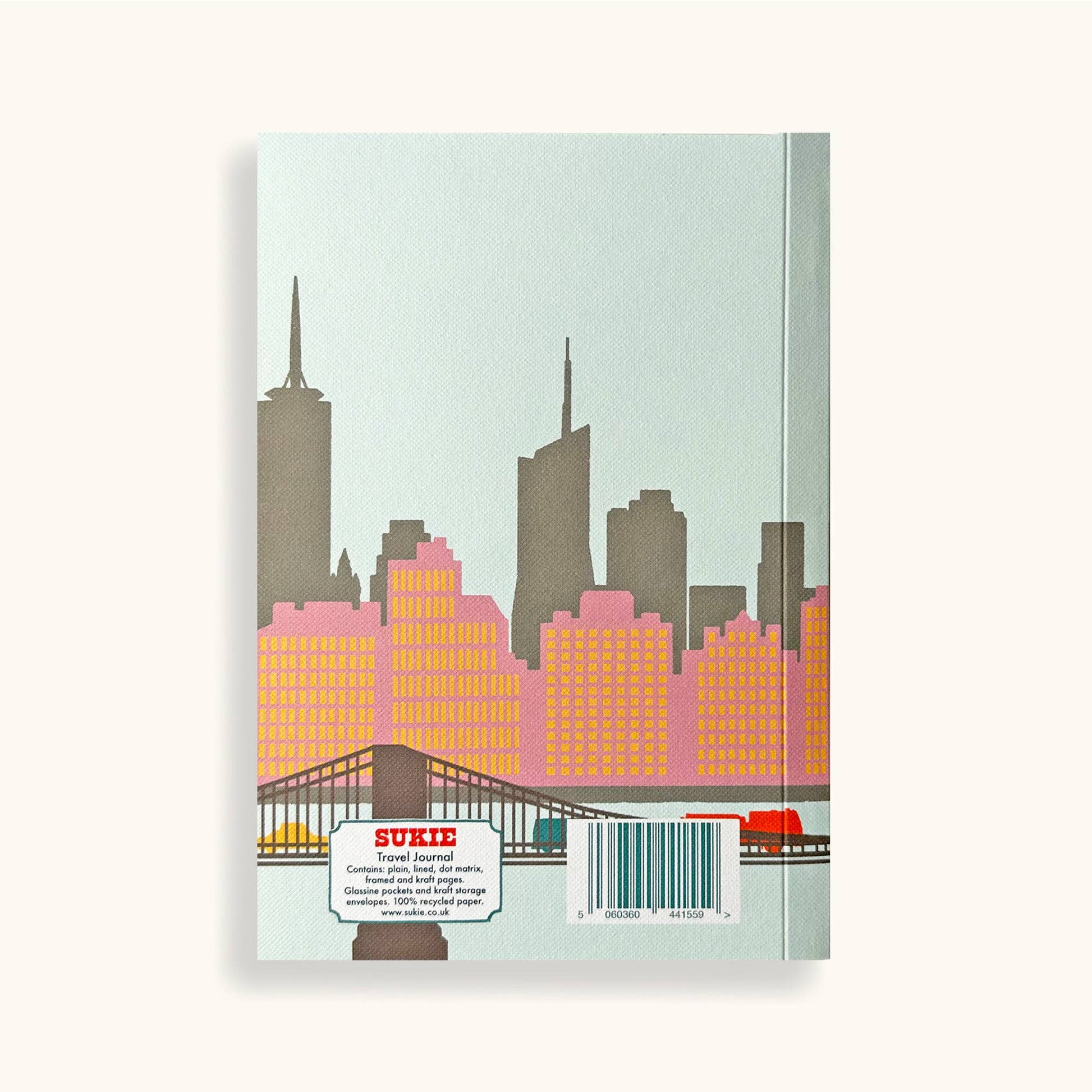 Travel Journal with a New York skyline, image taken from one of Sukie's original lino cut prints. Book contains an assortment of lined, plain, dot, craft and framed papers as well as glassine pockets and manila envelopes. With thick smooth papers and a subtly textured card cover.