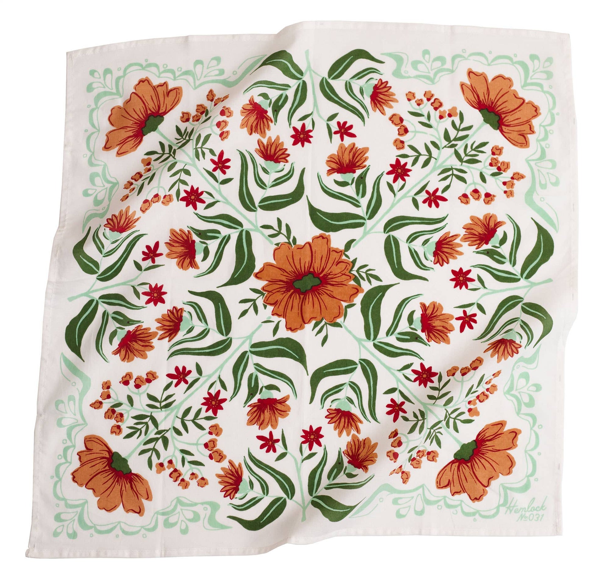 Color: White with Red & Green flowers Material: 100% premium cotton Sizing: 22x22 inches Designed in the U.S. Hand screen-printed in India Bandanas can be used in so many different ways! Use it as a handkerchief on hikes, wear it in your hair or on your clothes to spice up an outfit, tie it around your pup's neck to make them look dashing! Have fun with it!