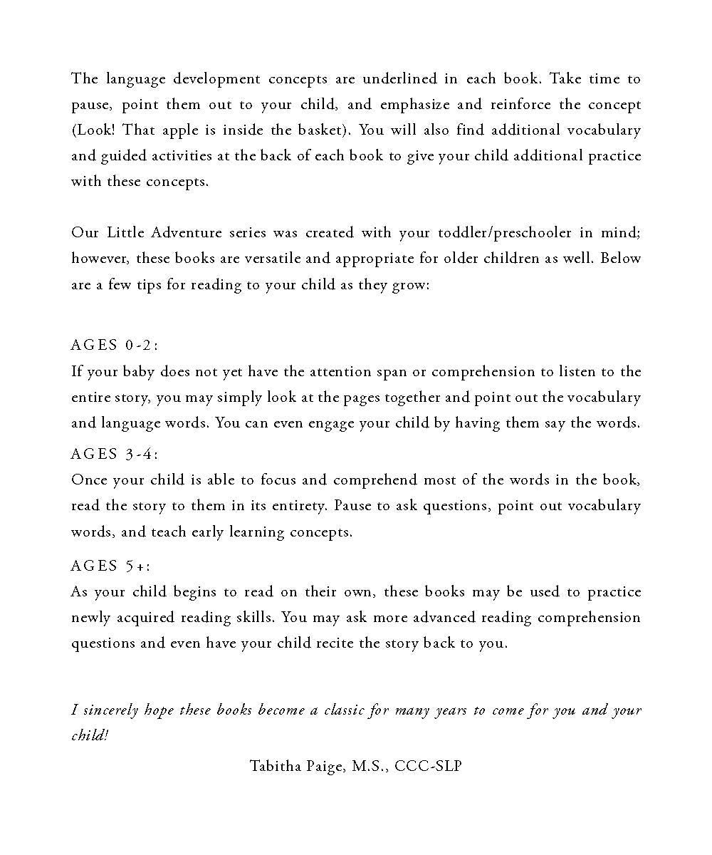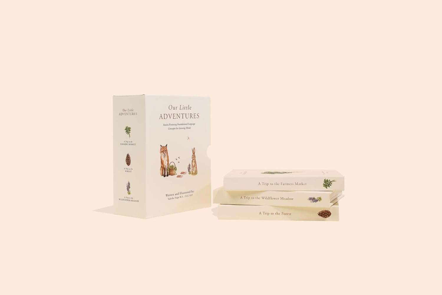 Stories Featuring Foundational Language Concepts for Growing Minds. Jump-start your young child's education with vocabulary and early language concepts using this beautiful board book set to help build your child's language skills and encourage them to explore nature. Tabitha Page, Licensed Speech Pathologist and Watercolor Artist takes your child on three different trips through nature in this book set.