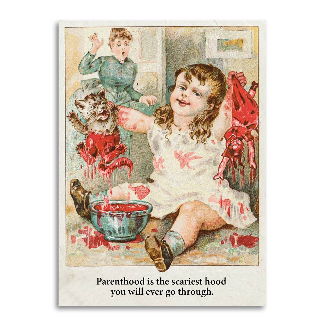 Hey, new moms and dads, we know you're in for a wild ride! This funny and vintage-inspired greeting card "Parenthood Is the Scariest Hood You Will Ever Go Through" perfectly captures the thrilling terror of becoming a parent. So, whether you're attending a baby shower or welcoming a new parent into the club, this card is a must-have. Parenthood may be scary, but you can always embrace the madness and show your loved ones that they're not alone in this wonderfully chaotic journey.