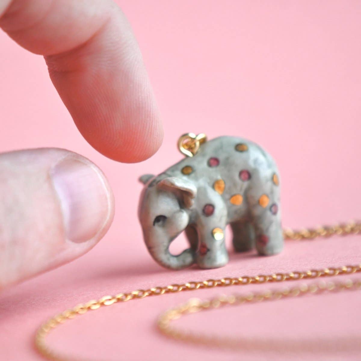 Step into a realm of whimsy and joy with our limited-edition Pink Polka Dot Elephant Necklace! This handcrafted porcelain pendant features a playful elephant adorned with a glossy pink polka dot pattern, capturing the essence of childlike wonder and imagination. Strung on a delicate gold chain, this necklace is a versatile and enchanting addition to any ensemble, from casual playdates to elegant tea parties.