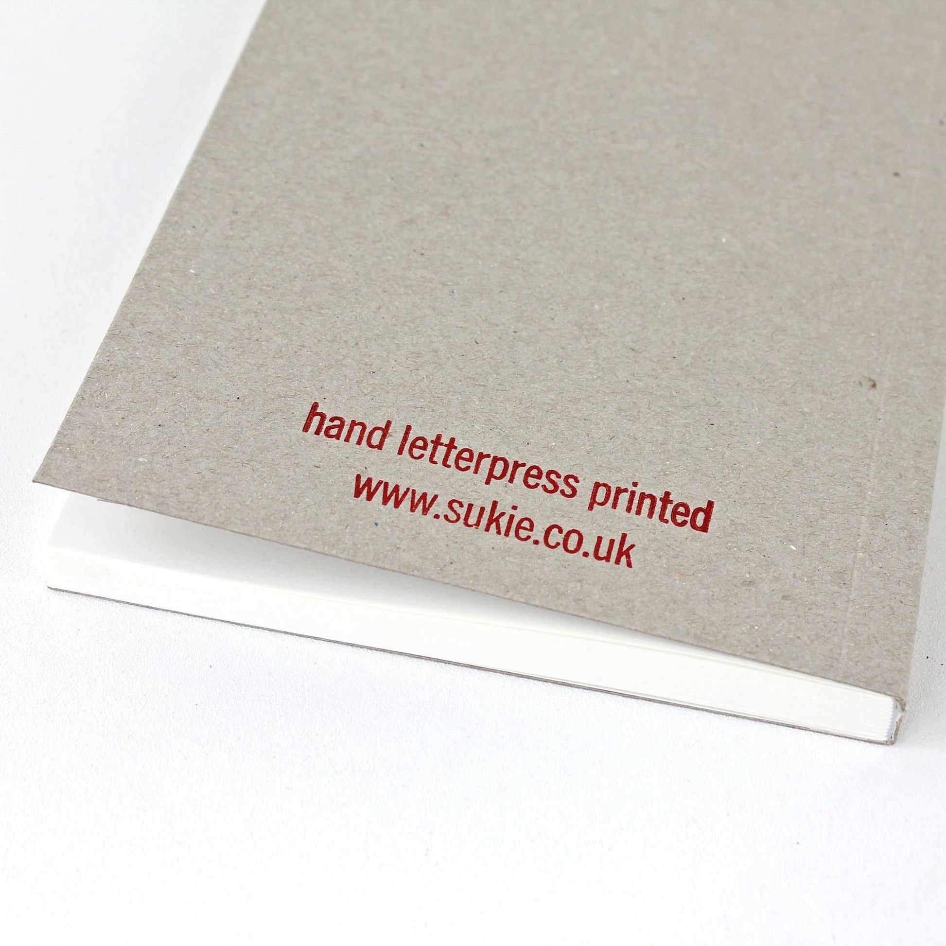 A Letterpress notebook hand printed in the Sukie studio on grey board, with the words PLAN B boldly printed in blue and red ink on the cover. When a back-up plan is needed! Behind the utilitarian greyboard cover are 144 lined pages of luxuriously smooth cream paper, a delight to write on. Individually packaged in a bio degradable cello bag, with product information on paper insert.