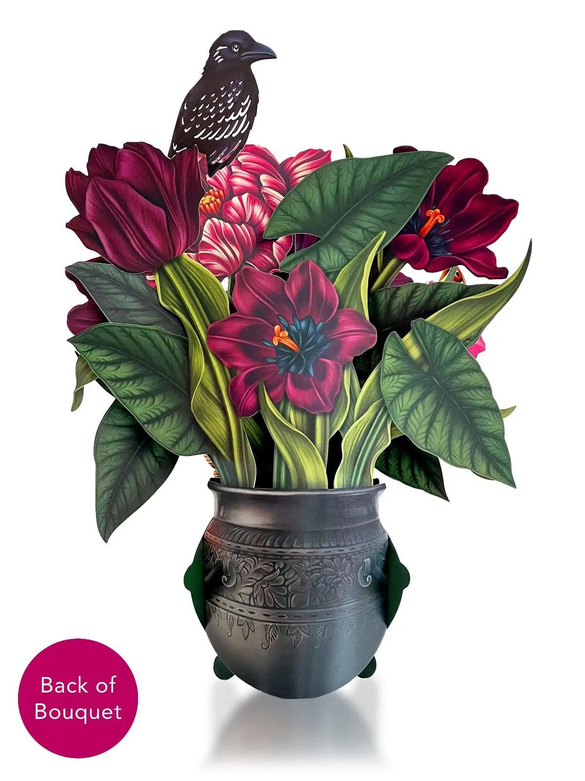 Experience the enchanting Moonlight Garden pop-up bouquet, just in time for Halloween! This bewitching arrangement of tulips and begonia leaves dazzle with velvety hues of deep purple and merlot. Displayed in a stunning pewter cauldron this bouquet comes complete with a mysterious raven and flutter of tiger moths for you to decorate. Whether you’re looking to set the scene for a Halloween party, a unique gift for a loved one, or simply want to add some spooky elegance to your home, this bouquet is the perfect choice!