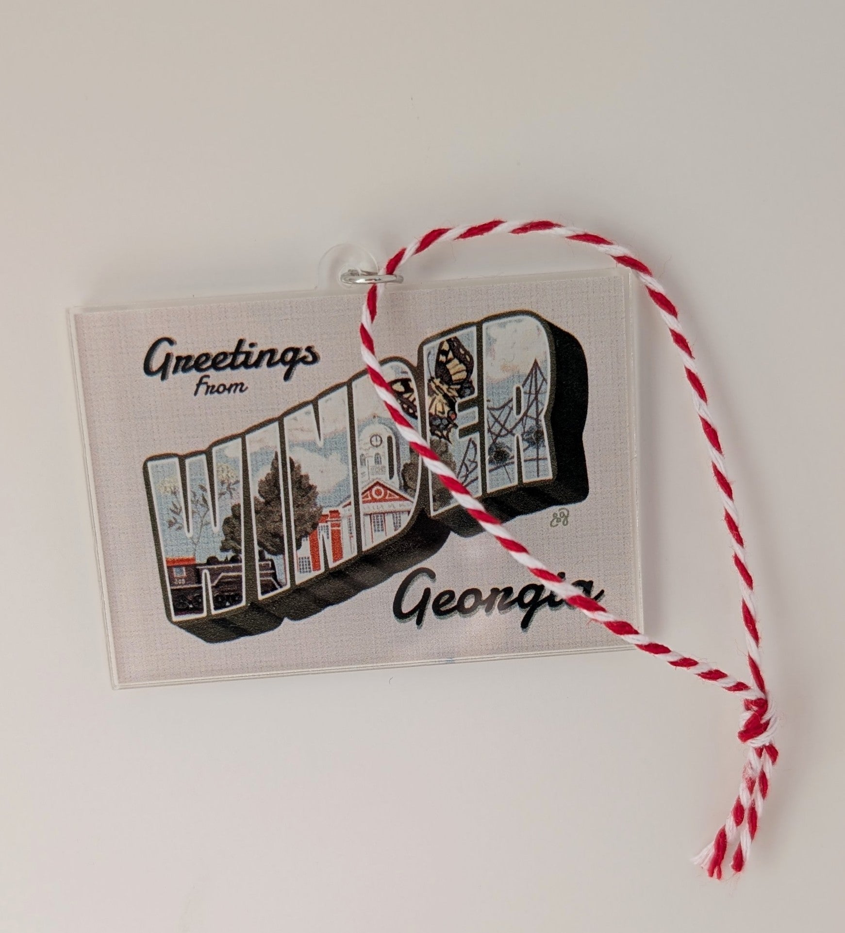 Greetings from Winder, Georgia ornament. Ornament measures 3"x2" and is ready to hang with a red and white striped string. Scenes pictured include a train, city hall, a butterfly, and a park net. Also available as a vinyl sticker or postcard.