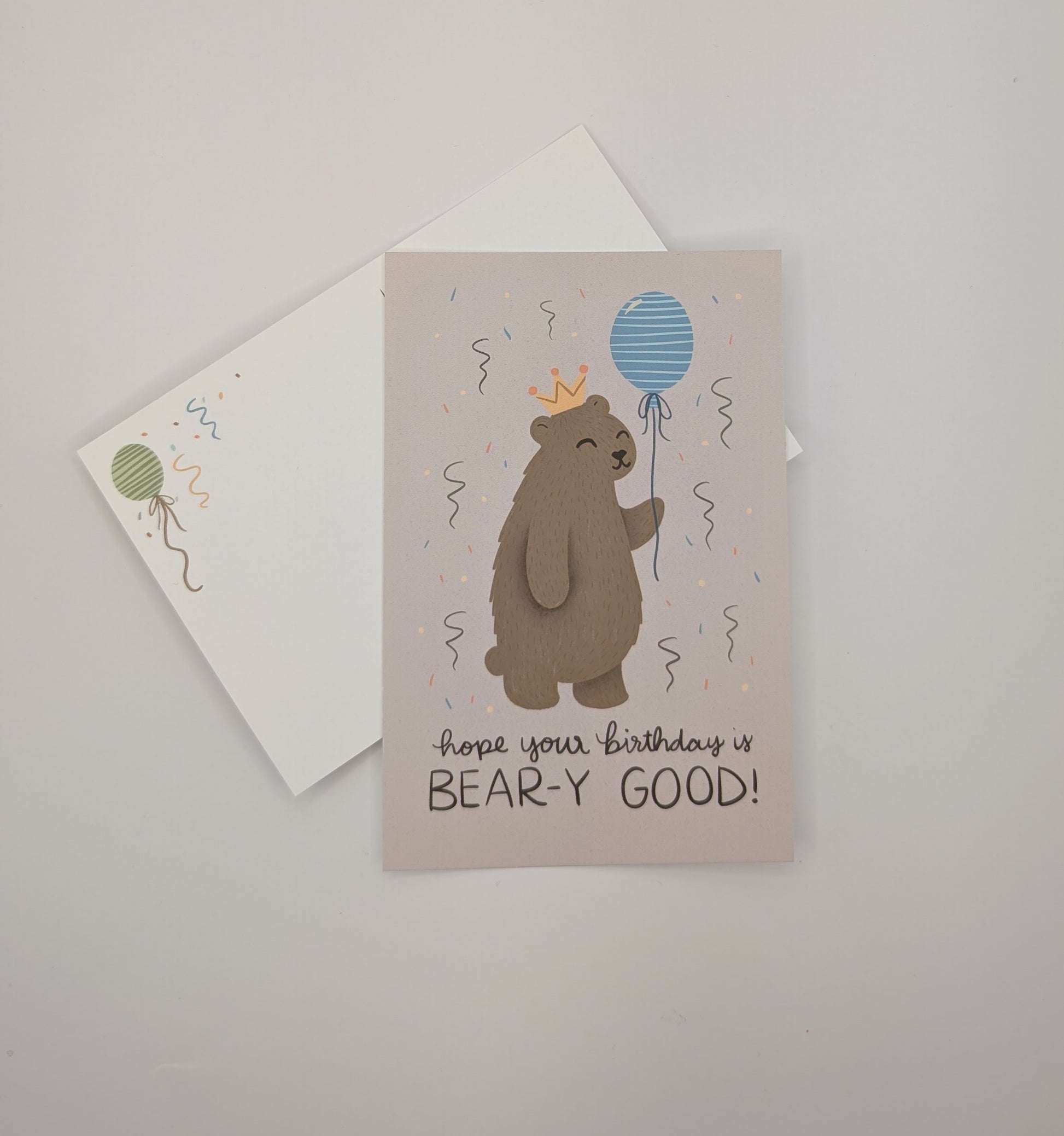 Set of 4 birthday themed postcards featuring animal puns. Llama, Bear, Toad, and Turtle all hope you have a happy birthday. Postcards measure 4"x6" and can be mailed with a postcard stamp. Designed by Stephanie Grant.