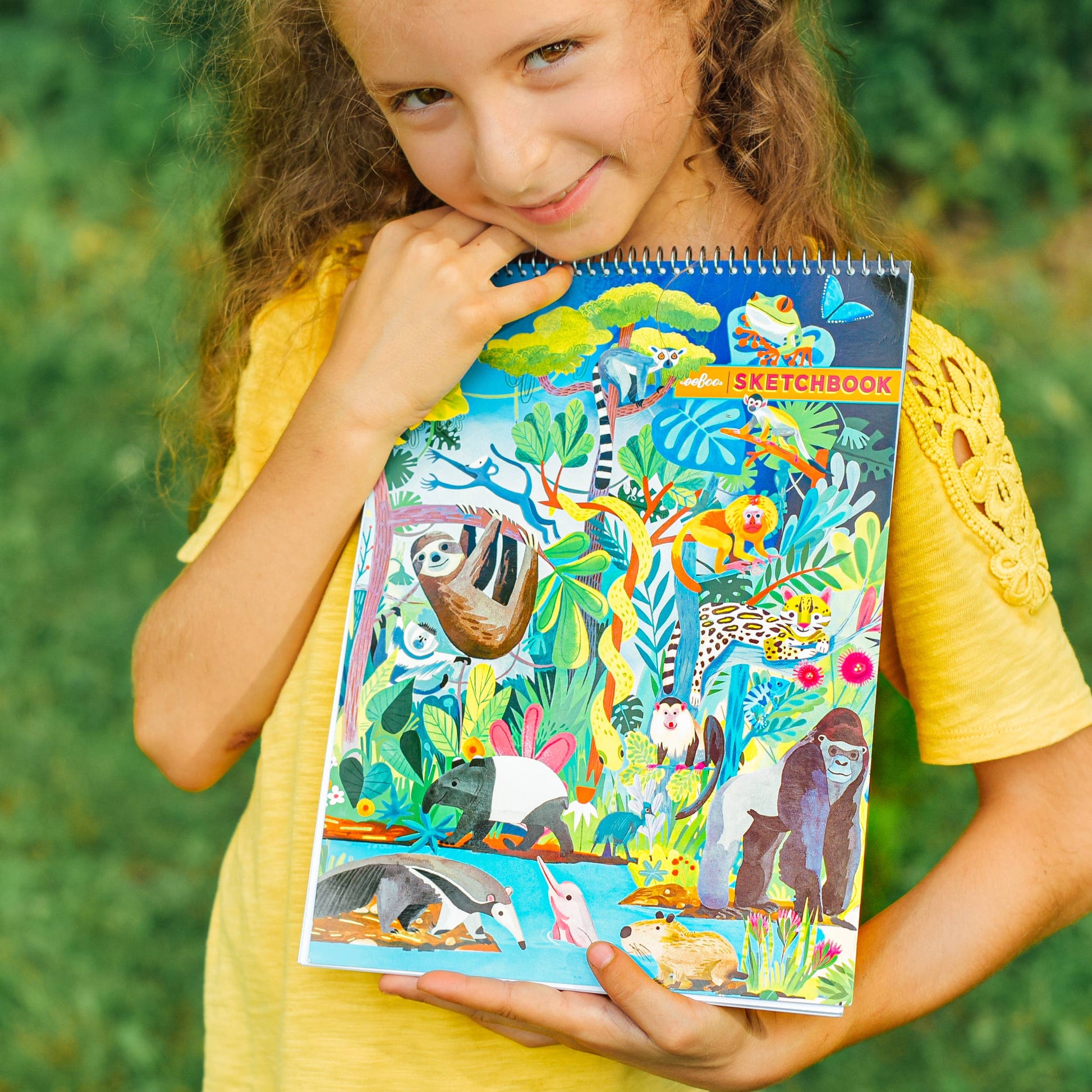 Imagine yourself amidst the majesty of the jungle with this delightfully illustrated Rainforest Sketch Book. Covered with a captivating scene full of forest friends, from Sloth to Jaguar, this spiral-bound pad will make a lovely addition to any young animal lover's art box. Cover illustration by Linda Bleck. Pack in your lunch bag for al-fresco sketching sessions or have around the house for doodling, journaling or making imaginative role-play games.