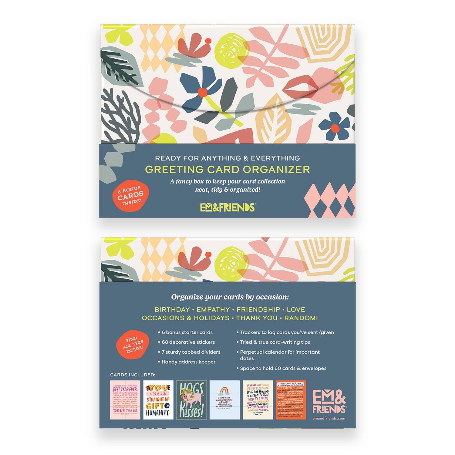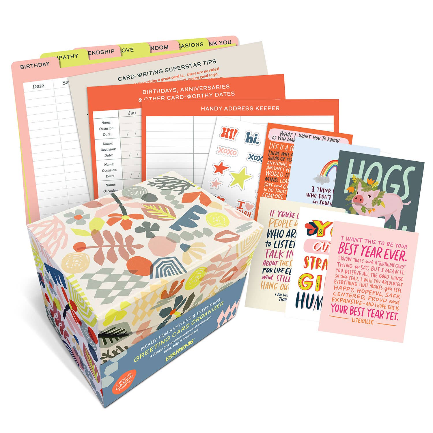 Hey, card lover! Here is a box that’s like a file organizer for your greeting cards, keeping ’em organized & safe from coffee spills & cat paws. Besides being cute and sturdy, it’s roomy enough for 60+ cards—and comes stocked with 6 EMF greeting cards! Plus it’s got stickers, tabbed dividers, and a calendar for important dates! OH YEAH, plus an address keeper, trackers to log cards you’ve sent, and tips for writing cards! Did we forget anything? Hmmmmmm… Well, it doesn’t come with a nice warm mug of tea. We thought it might spill.