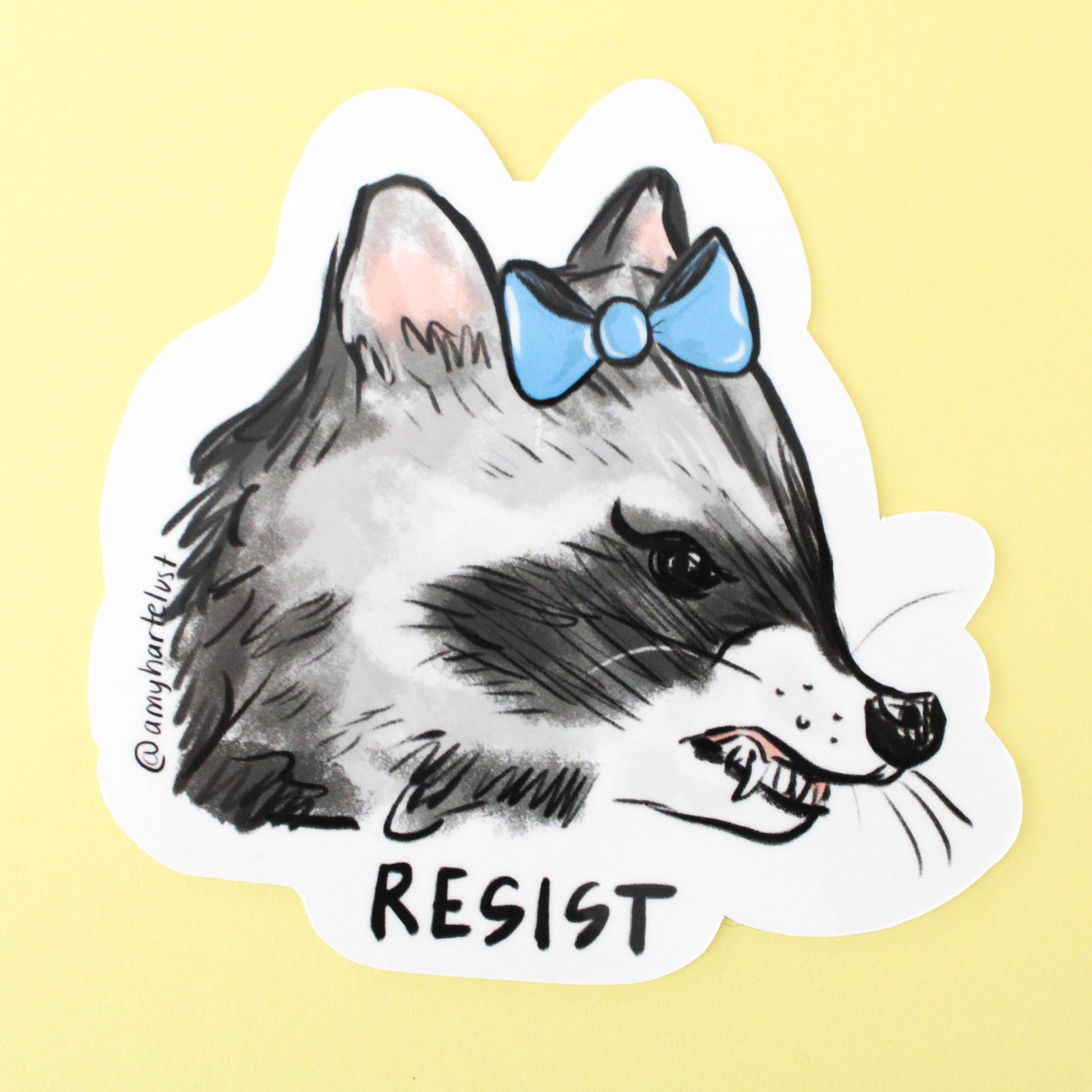 - Image: Snarling raccoon with a blue bow and the word resist.